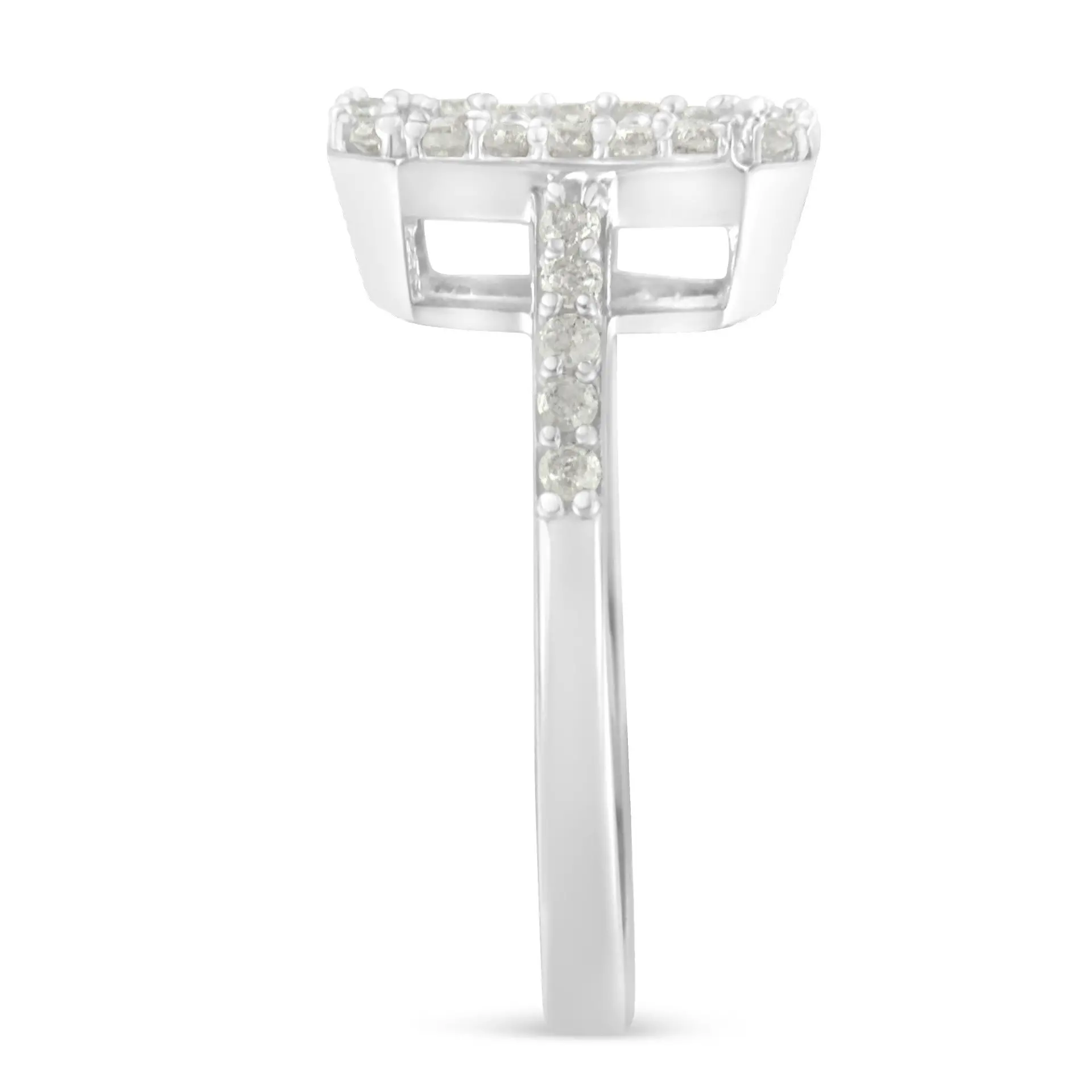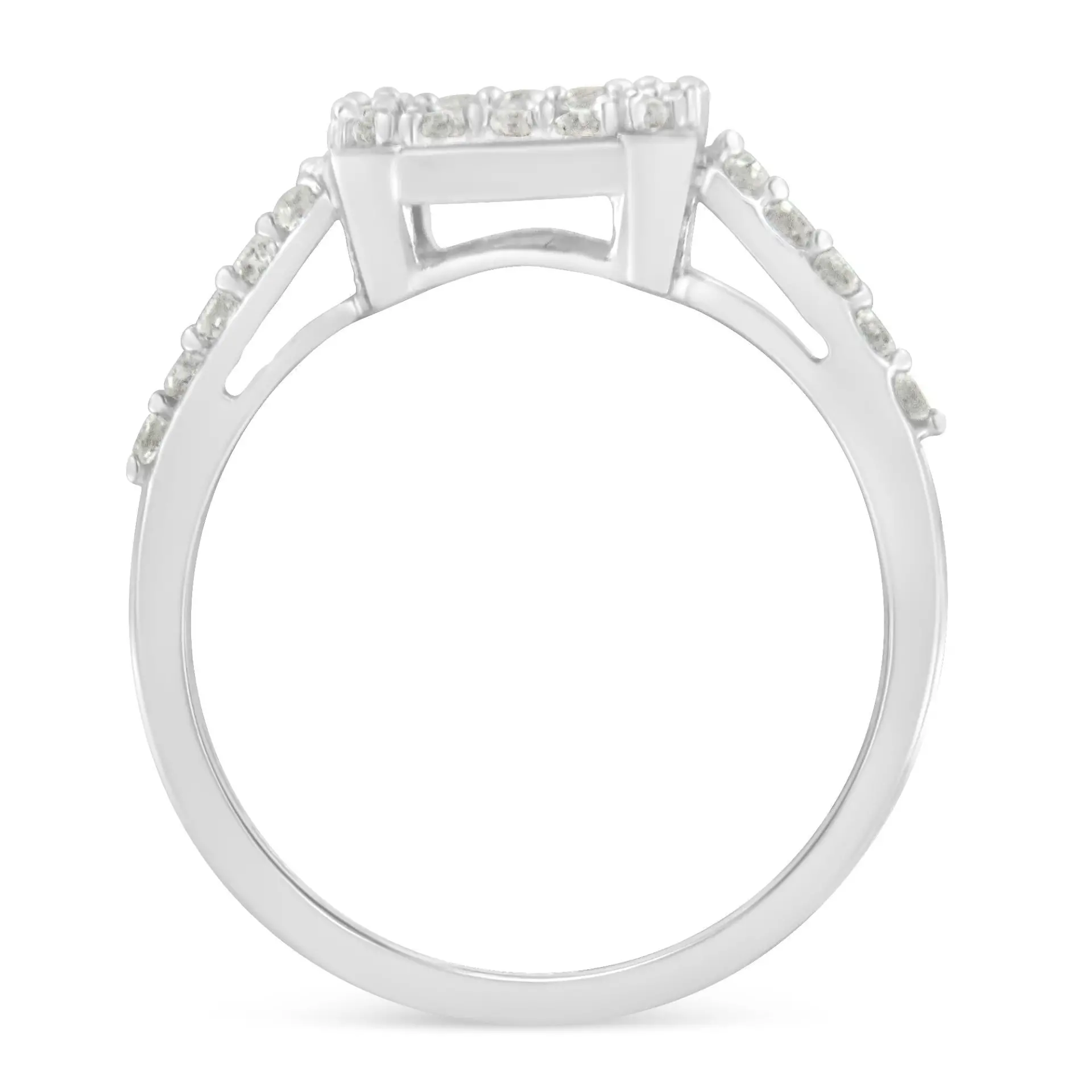 Elegant and timeless, this gorgeous 92.5% sterling silver and diamond cocktail ring features 1.0 carat total weight of diamonds with a whopping 38 individual gemstones. The fashion ring features an emerald cut gemstone shaped cluster of round brilliant cut diamonds inside an emerald shaped halo. The shank is studded with five white diamonds each. The cathedral style band has a simple geometric openwork gallery. This classic, feminine cocktail ring makes a great gift for any special occasion! Whether worn for daytime glamour or evening sparkle, this statement ring is gorgeously versatile. It can act as a promise ring or engagement ring for the woman with a bold sense of style. Give her a gift that will perfectly complement her favorite ensemble.