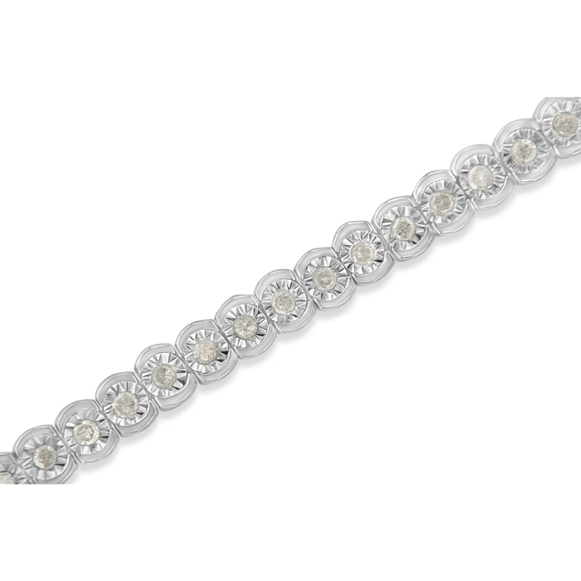 Elegant and timeless, this gorgeous sterling silver link bracelet features 1.0 carat total weight of round, rose cut, promo quality diamonds with 61 stones in all. The tennis bracelet features round links with illusion set diamonds in our unique miracle-plate setting, which centers each genuine diamond in a mirror-finish, high-polish frame that gives the illusion of a much larger stone. The links have half-moon borders. Rose-cut, promo quality diamonds are milky and cloudy in nature. The 7 bracelet fastens with a box with tongue clasp and is crafted of real 92.5% sterling silver that has been electro-coated with genuine rhodium (a platinum-family metal), ensuring it will keep a tarnish-free shine for years to come. This classic, slender tennis bracelet makes a great gift for any special occasion! Whether worn for daytime glamour or evening sparkle, this bracelet is gorgeously versatile. Give her a gift that will perfectly complement her favorite ensemble.