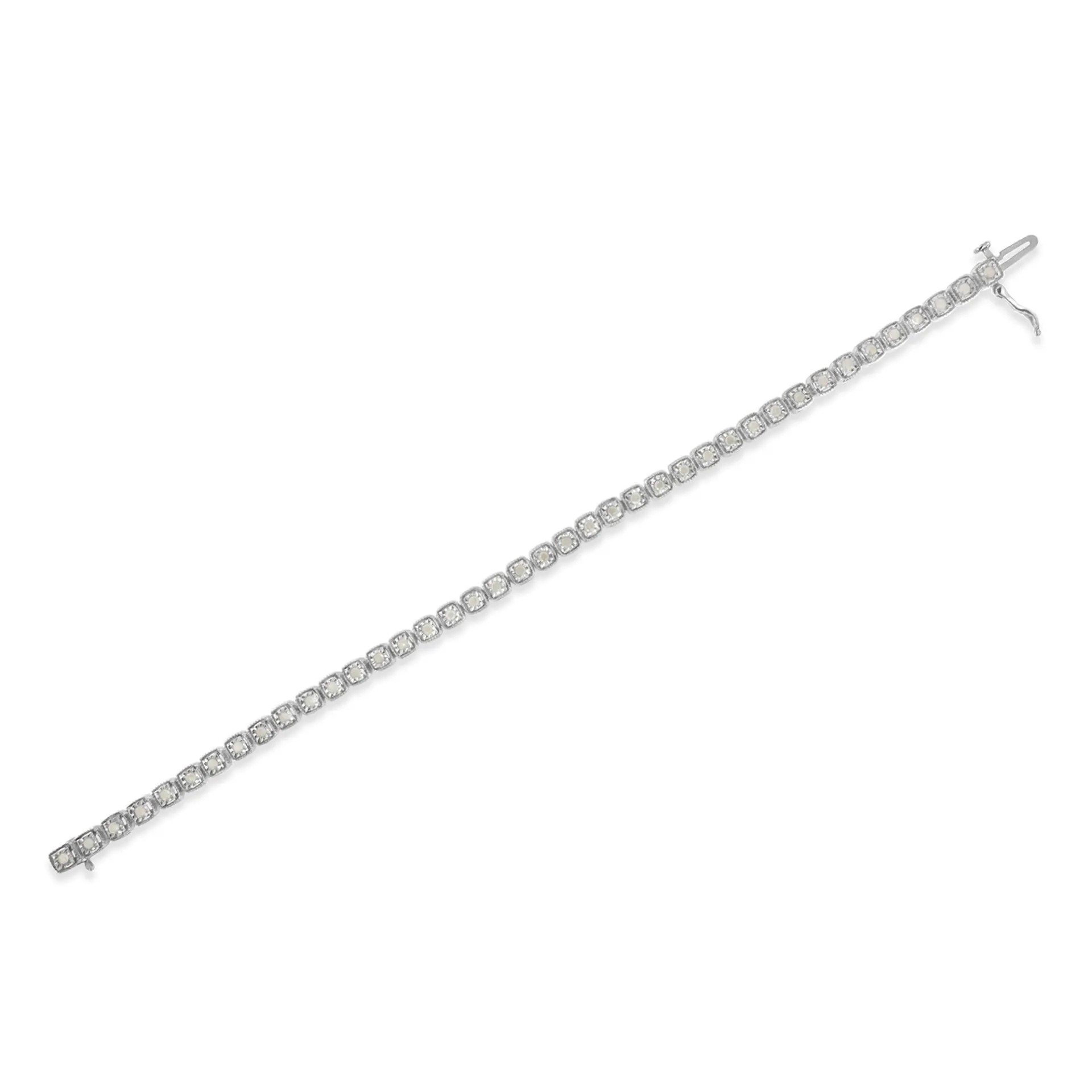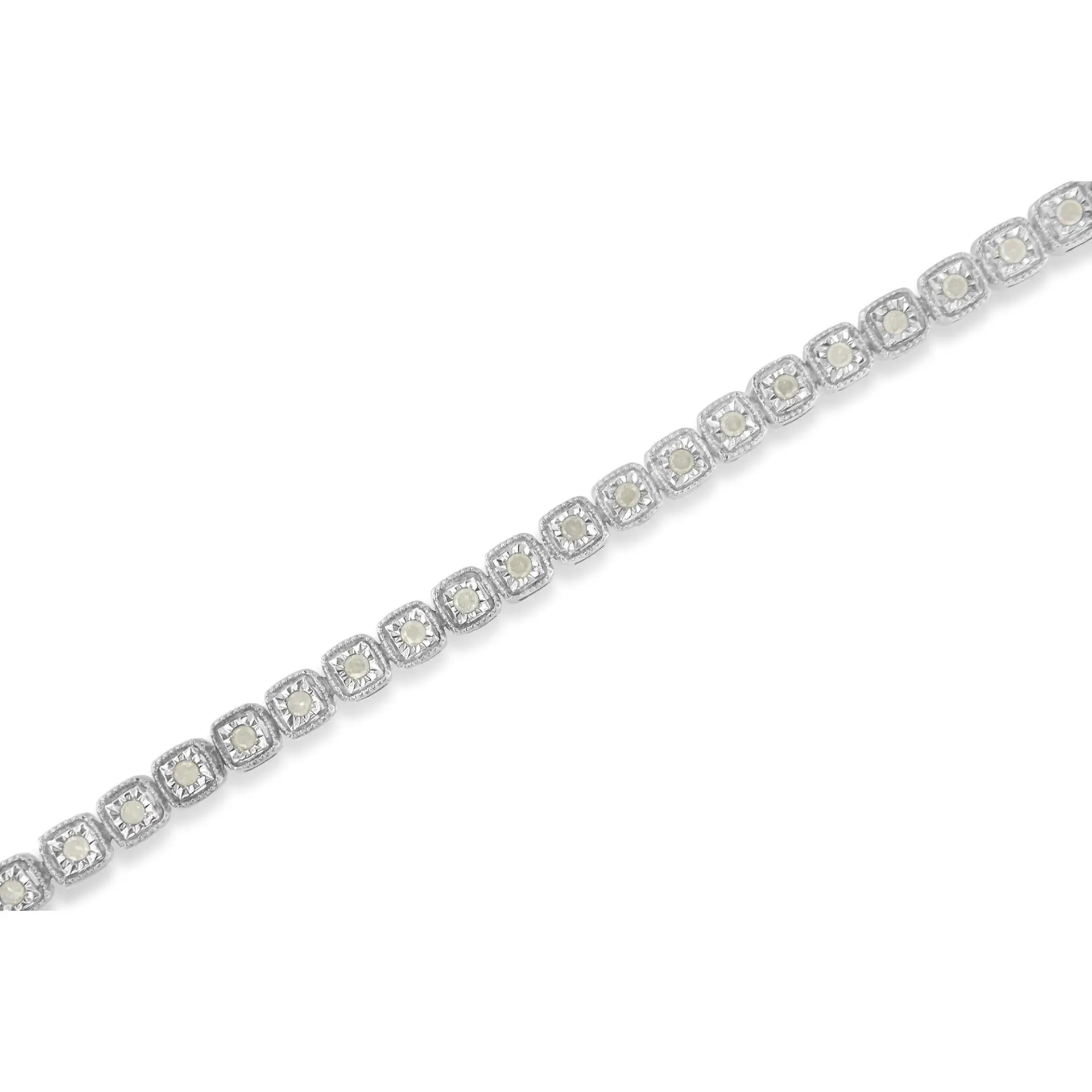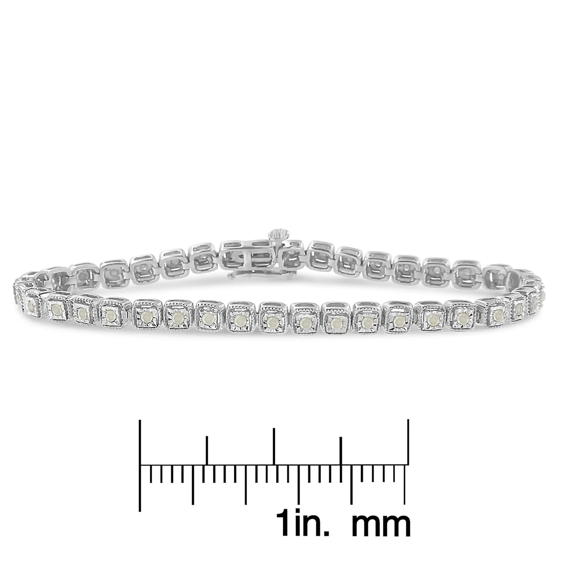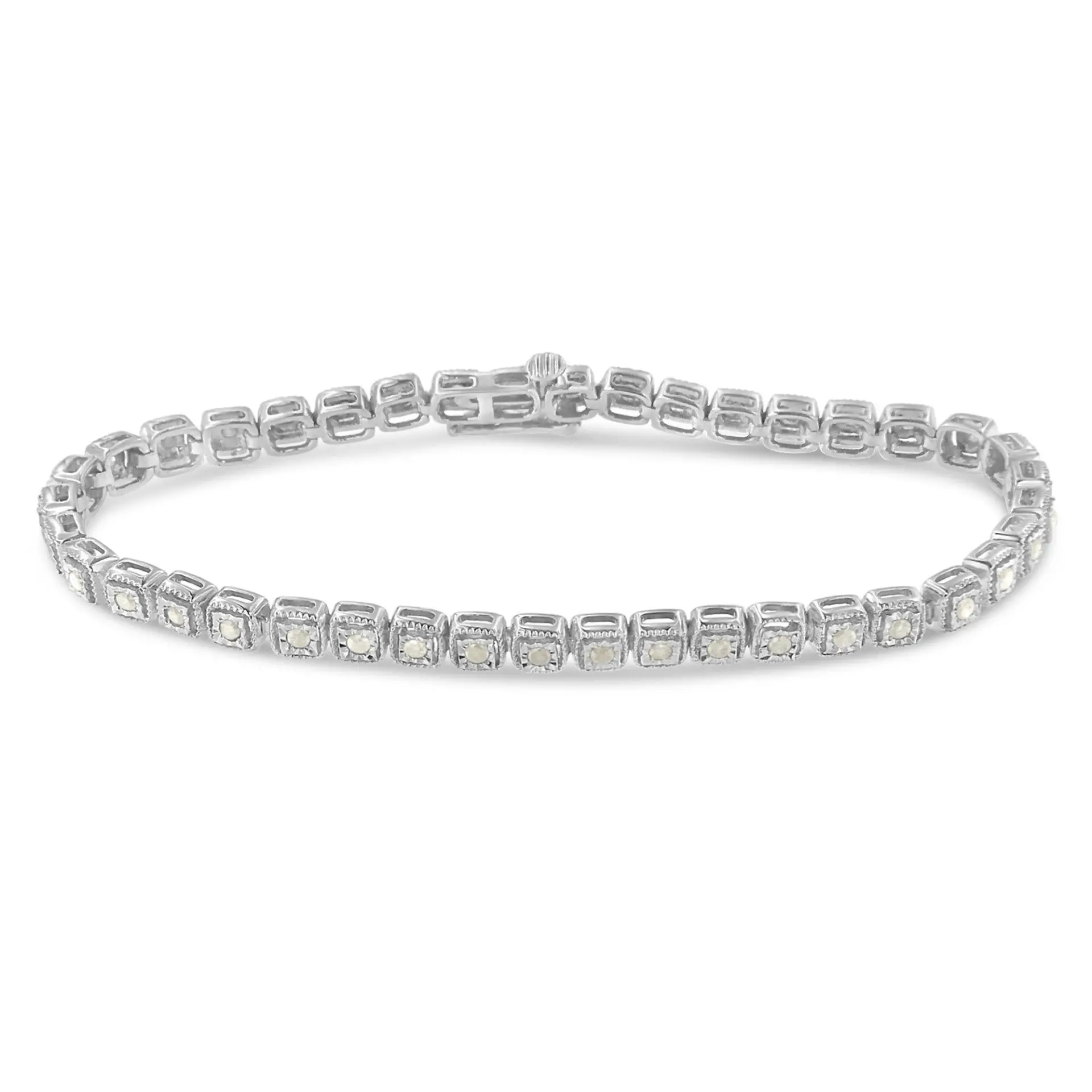 Elegant and timeless, this gorgeous sterling silver link bracelet features 1.0 carat total weight of round, rose cut, promo quality diamonds with 40 stones in all. The tennis bracelet features square links with milgrain borders with round diamonds in the center in our unique miracle-plate setting, which centers each genuine diamond in a mirror-finish, high-polish frame that gives the illusion of a much larger stone. Rose-cut, promo quality diamonds are milky and cloudy in nature. The 7 bracelet fastens with a box with tongue clasp and is crafted of real 92.5% sterling silver that has been electro-coated with genuine rhodium (a platinum-family metal), ensuring it will keep a tarnish-free shine for years to come. This classic, slender tennis bracelet makes a great gift for any special occasion! Whether worn for daytime glamour or evening sparkle, this bracelet is gorgeously versatile. Give her a gift that will perfectly complement her favorite ensemble.