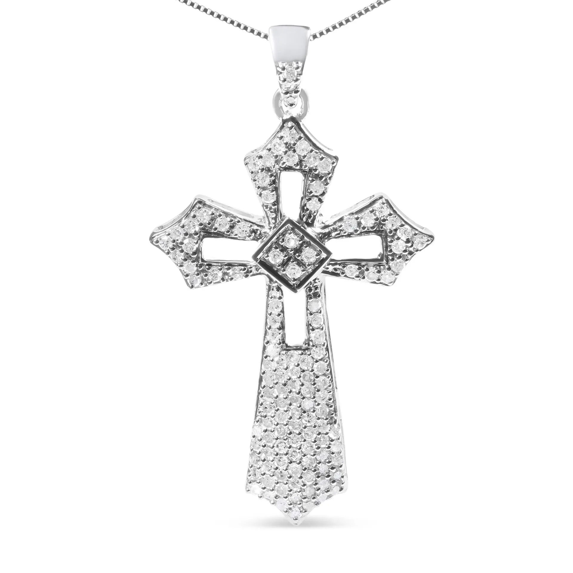 Elevate your style with a touch of glamour and timeless elegance. This stunning pendant necklace is crafted from premium .925 sterling silver and features a breathtaking diamond-encrusted Fleur De Lis cross design. With 112 sparkling diamonds, each hand-selected for their exceptional quality, this piece boasts a total weight of 1.0 carats and boasts a beautiful H-I color and I2-I3 clarity. Suspended from a delicate 18-inch box chain and fastened with a secure spring ring clasp, this pendant necklace is the perfect way to add a touch of luxury to any outfit. Whether you’re dressing up for a special occasion or simply want to add some sparkle to your everyday look, this stunning necklace is sure to turn heads.