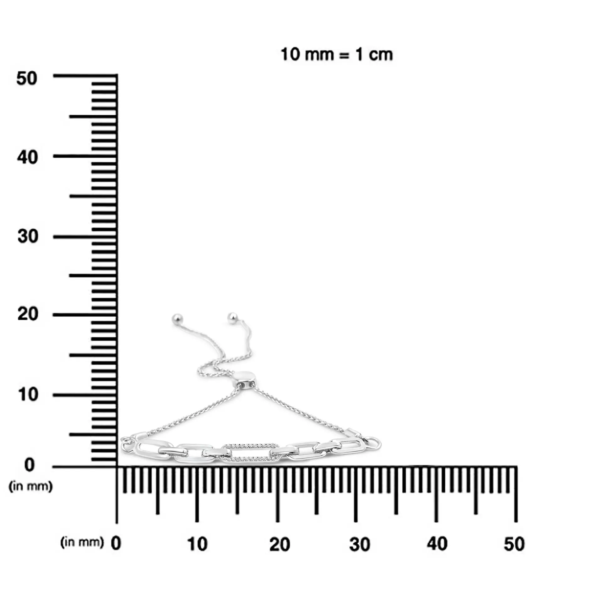 Delicately crafted from high-quality .925 sterling silver, this exquisite bracelet embodies modern sophistication intertwined with a hint of timeless charm. Its sterling brilliance, enhanced with rhodium plating, ensures a radiant glow that complegrades with the wearer’s every movement. Central to its uniquely alluring design is the innovative paperclip link, embellished naturally with diamonds totaling 1/10 carats. These precious stones catch the light with their I-J color and I2-I3 clarity, infusing every gesture with a sparkle synonymous with elegance. The adjustable bolo closure, refined with dainty spherical beads, is both practical and stylish, offering a customizable fit for wrist sizes from 4 to 10 inches. This piece is not just jewelry; it’s a versatile companion, perfect for upscale events or adding a touch of glamour to your everyday ensemble.