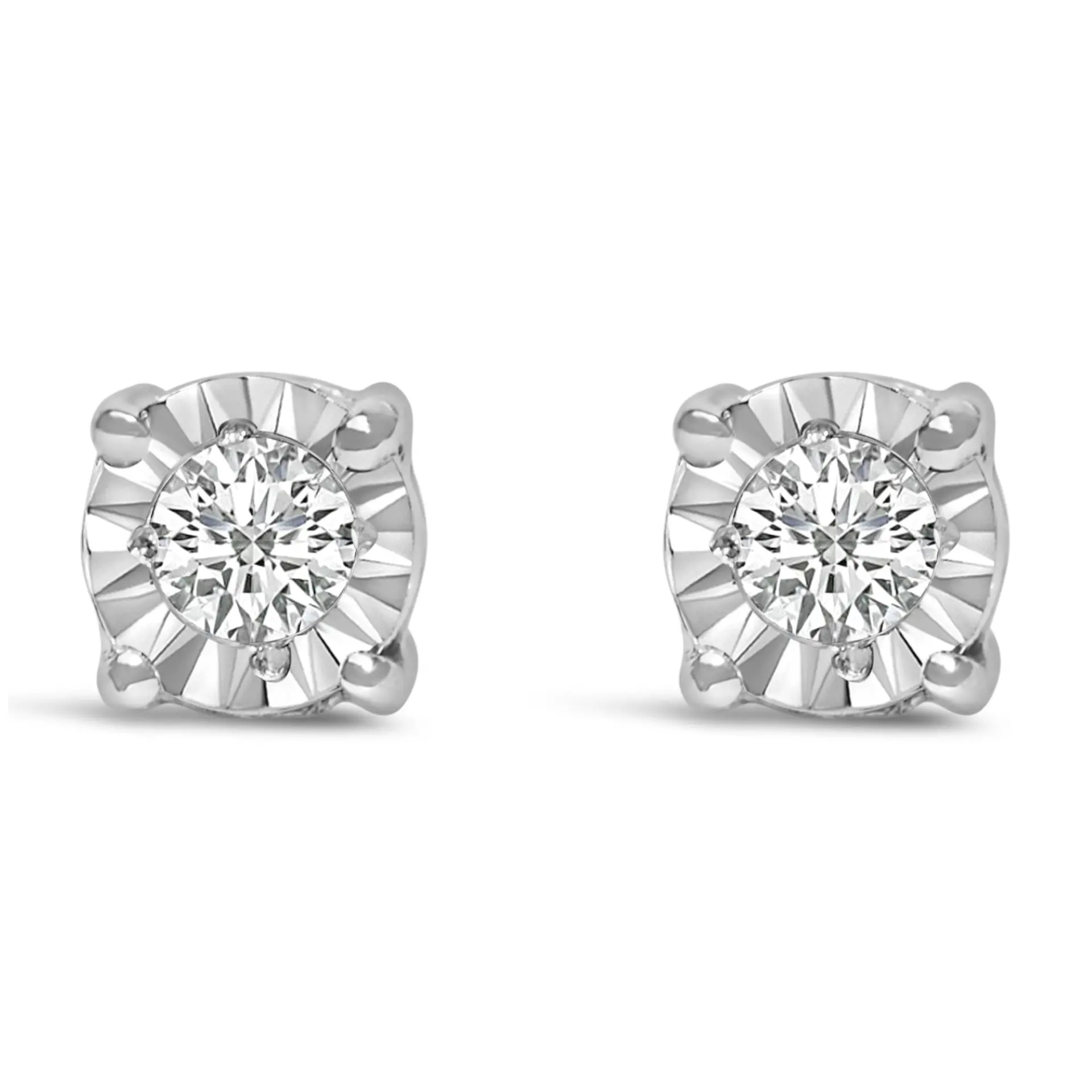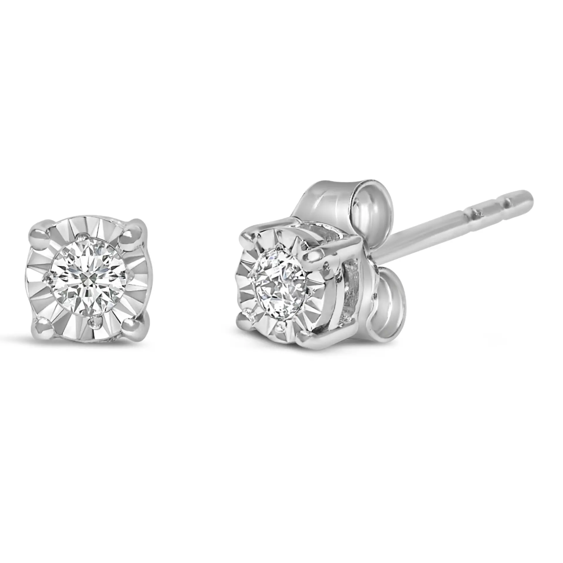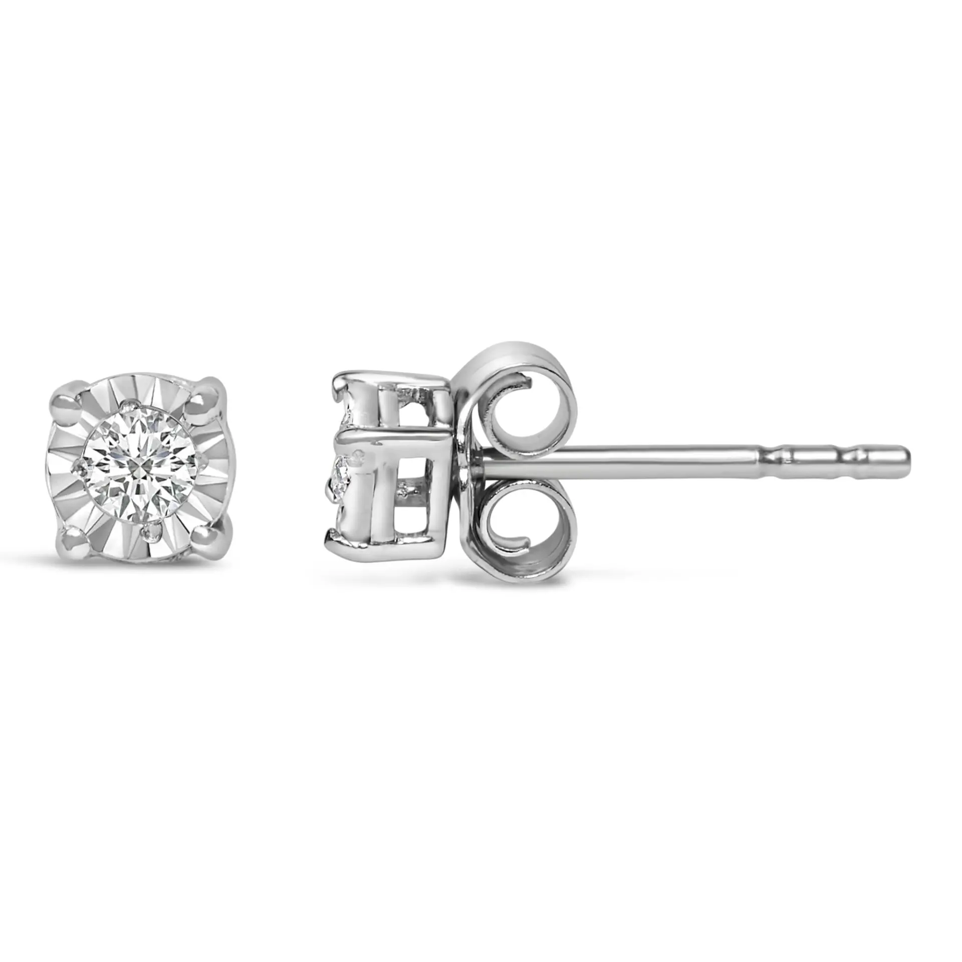 Draped in the tender embrace of .925 sterling silver, plated with radiant rhodium, these exquisite stud earrings whisper timeless elegance. Embedded in each delicate piece lies a round brilliant-cut lab-grown diamond, meticulously chosen for its pristine F-G color and VS1-VS2 clarity, combining to a total weight of 1/10th carat. The miracle setting, a marvel of craftsmanship, amplifies their innate splendor, making each diamond gleam with an ethereal brilliance, surpassing expectations of their stature. The secure push-back closures ensure that the earrings are as practical as they are beautiful, merging comfort with class. These earrings are more than an accessory; they are a testament to refined taste, a symbol of ethical luxury, and a promise of radiant memories. They beckon to those who seek a touch of sophistication, an adornment that transcends fleeting trends, embedding itself in the story of your life with every sparkling glance.