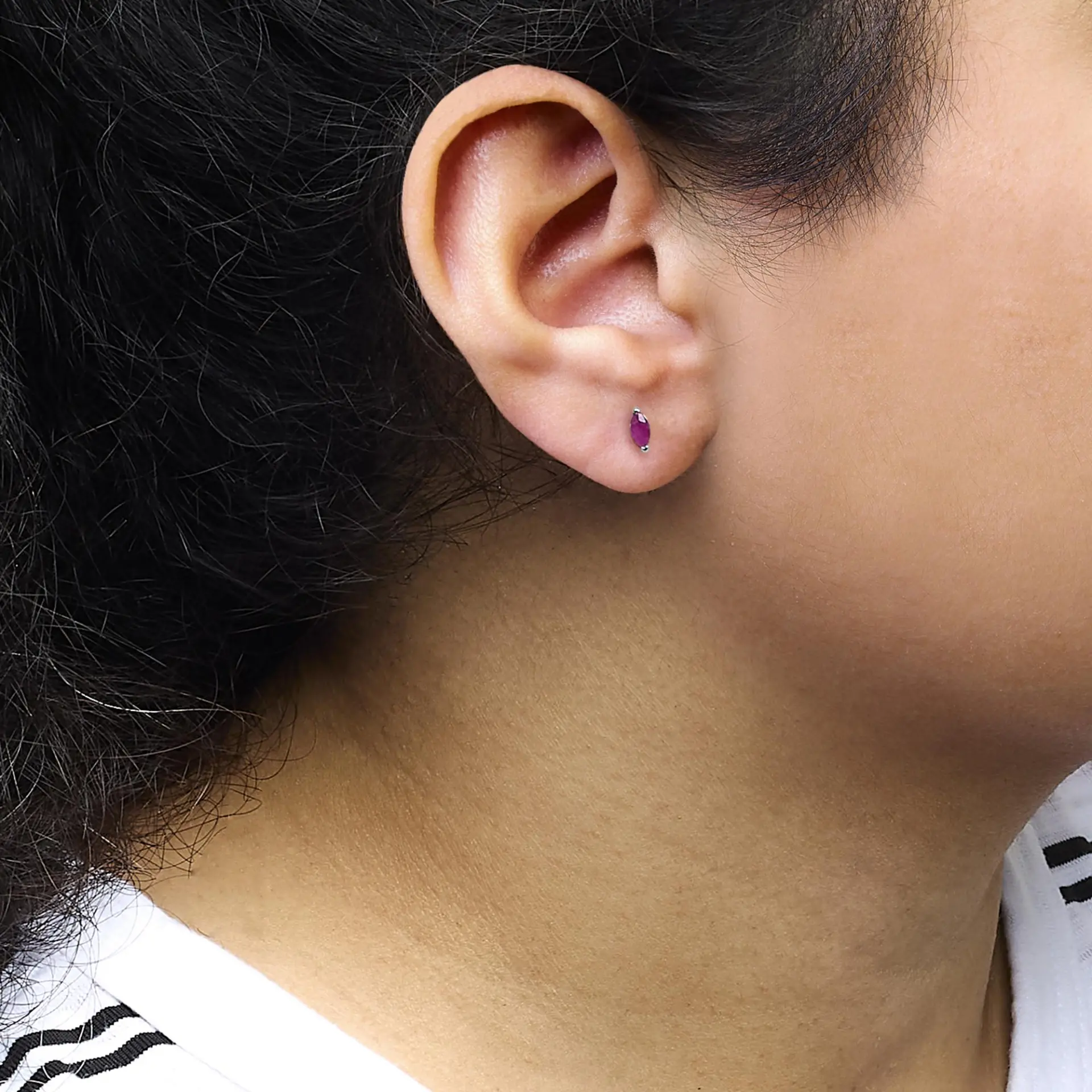 Drape your ears in the scintillating splendor of these .925 sterling silver solitaire stud earrings, each adorned with a marquise-cut, lab-created pink ruby. The vibrancy of these meticulously color-treated gemstones offers a glimpse into a world where elegance converges with modern craftsmanship. Nestled in a secure two-prong setting and finished with rhodium for added brilliance and durability, these earrings shine with a luster that captivates and enchants. The minimalist design magnifies the gemstone’s vivid hue and captivating sparkle, ensuring that these earrings not only accessorize an outfit but enhance it. Perfect for securing your style, their screw-back design promises a comfortable fit for continuous wear. Embrace these gems as your everyday luxury, a bright companion to both lavish and understated occasions.