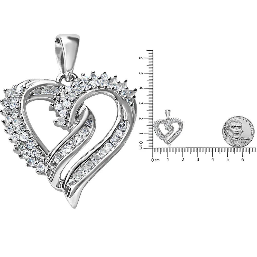 This heart pendant necklace speaks volumes of your love that features rows and loops of shimmering diamonds that beam bright rays of sparkle. The .925 sterling silver casts a ribbon-like silhouette with sculpted loops. The delicate, graceful outline is a perfect example of elegant style with round white diamonds in prong and channel settings. The diamonds are of a total1/2 cttw with an approximate I-J color and I3 clarity. The contemporary yet classic 18″ box chain sits close to the heart and secures with a spring ring clasp.