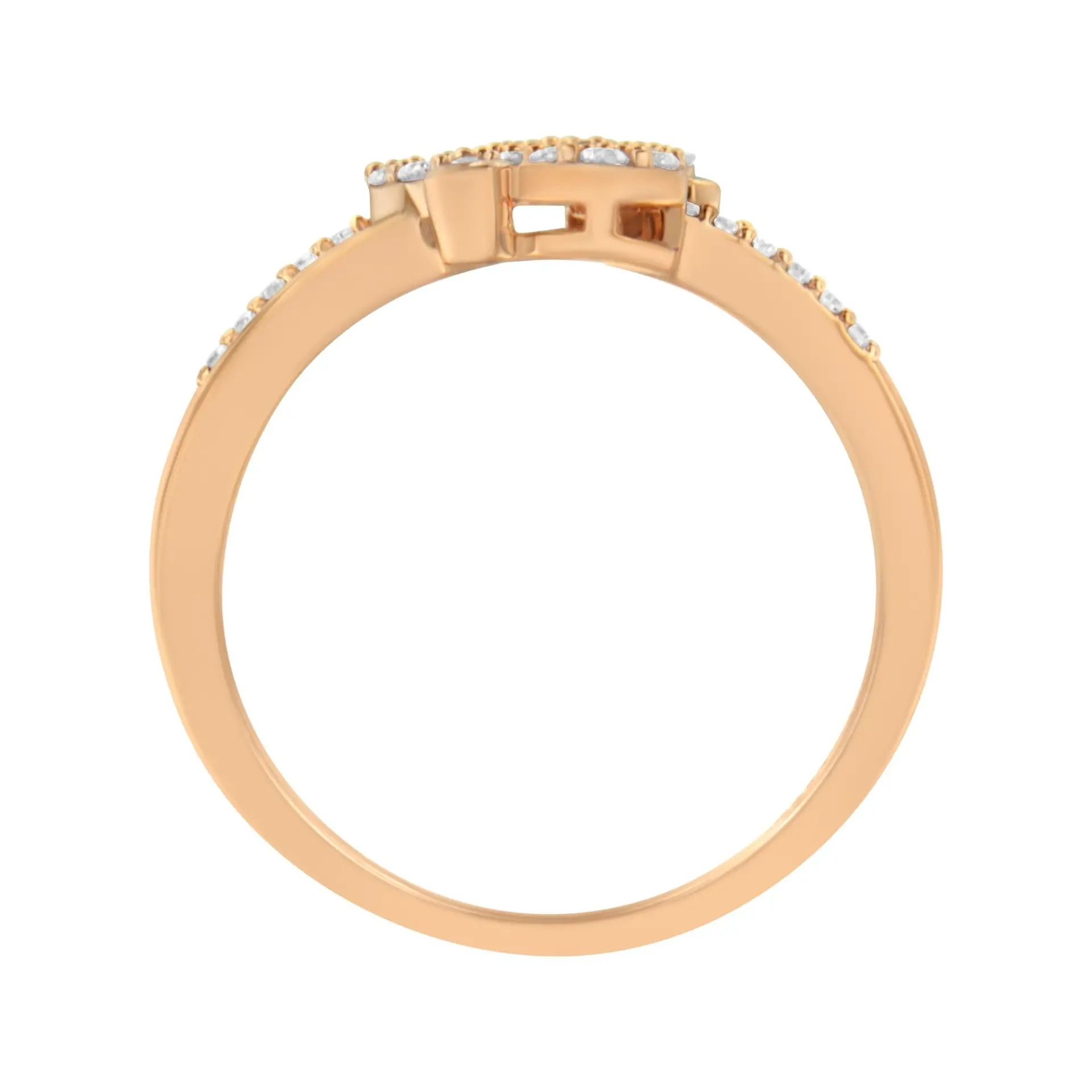 This lovely 14k rose gold plated sterling silver ring glitters with 1/2ct TDW of diamonds. A split ring band features three round cut diamond circular clusters accented by additional scattered diamonds. Round cut diamond line the ring band adding an extra twinkle to the design.