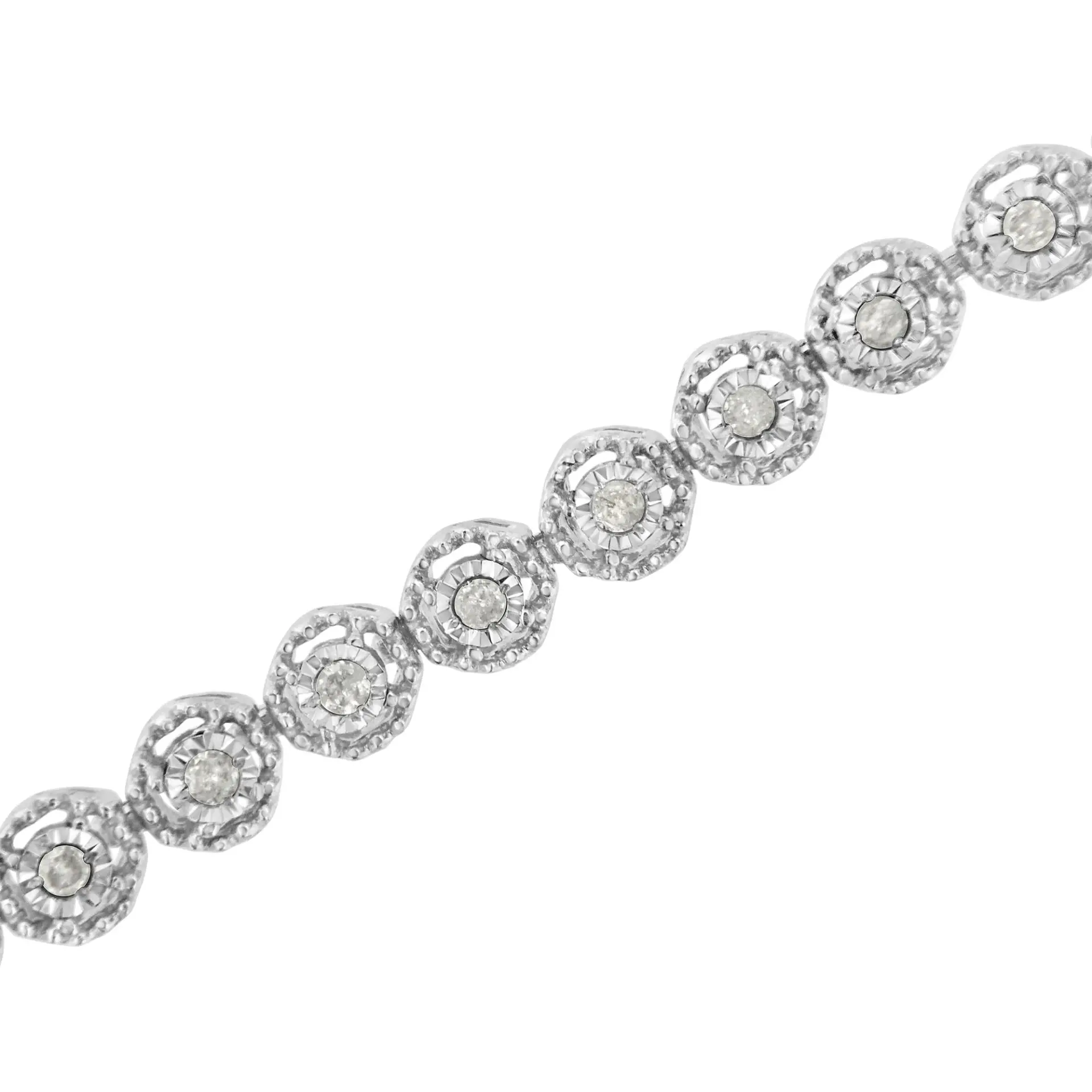 Delicate and timeless, this diamond bracelet is crafted in cool sterling silver and features 1/2ct TDW of glittering round cut diamonds. A round diamond in a miracle setting sits inside a floating beaded halo. The unique setting makes the diamonds look larger. A box with clasp secures the design.
