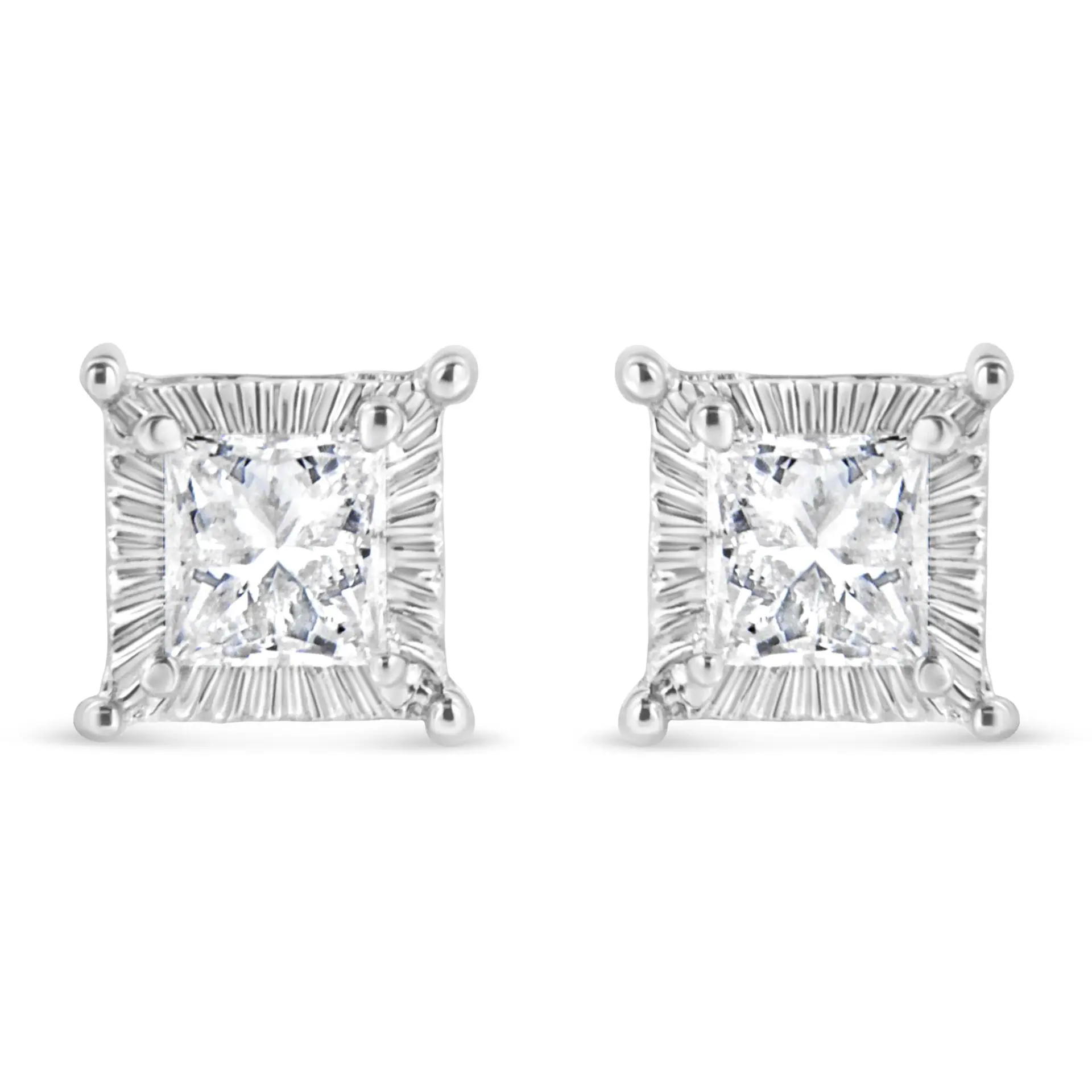 Dazzle with these unique miracle set diamond studs. This authentic design is crafted of real 92.5% sterling silver that has been electro-coated with genuine rhodium (a platinum-family metal), a precious metal that will keep a tarnish-free shine for years to come. Princess-cut diamonds are the centrally set stones, and smaller round-cut diamonds line the inner edges of these earrings. These 1/2 cttw studs are perfect accessory for your everyday wear.