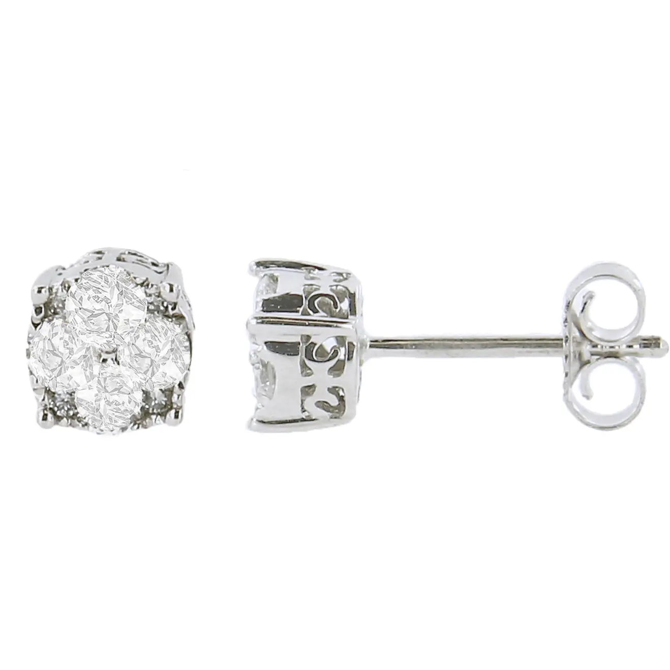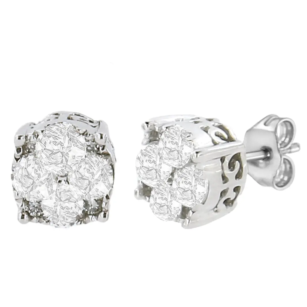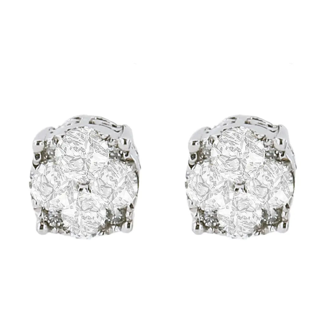 Elegant and timeless, these gorgeous 92.5% sterling silver cluster stud earrings feature 0.5 carat total weight of diamonds with 16 individual stones. Four large round brilliant cut diamonds are surrounded with four petite diamonds that fill in the perimeter to make a round cluster composite diamond. This illusion is enforced by the presence of four prominent prongs that look like they are holding one large stone. The earrings feature double notched friction posts with secure butterfly back pushback closures. These classic earrings make a great gift for any special occasion! Diamonds are thought to give the wearer clarity and illuminate solutions to lifes problems, as well as encouraging abundance, strength, courage, harmony, faithfulness, and commitment. These stud style earrings are subtle enough for casual affairs but sparkle in formal settings as well. Coordinate these earrings with your favorite diamond necklace or other diamond jewelry to create a complete elegant ensemble.