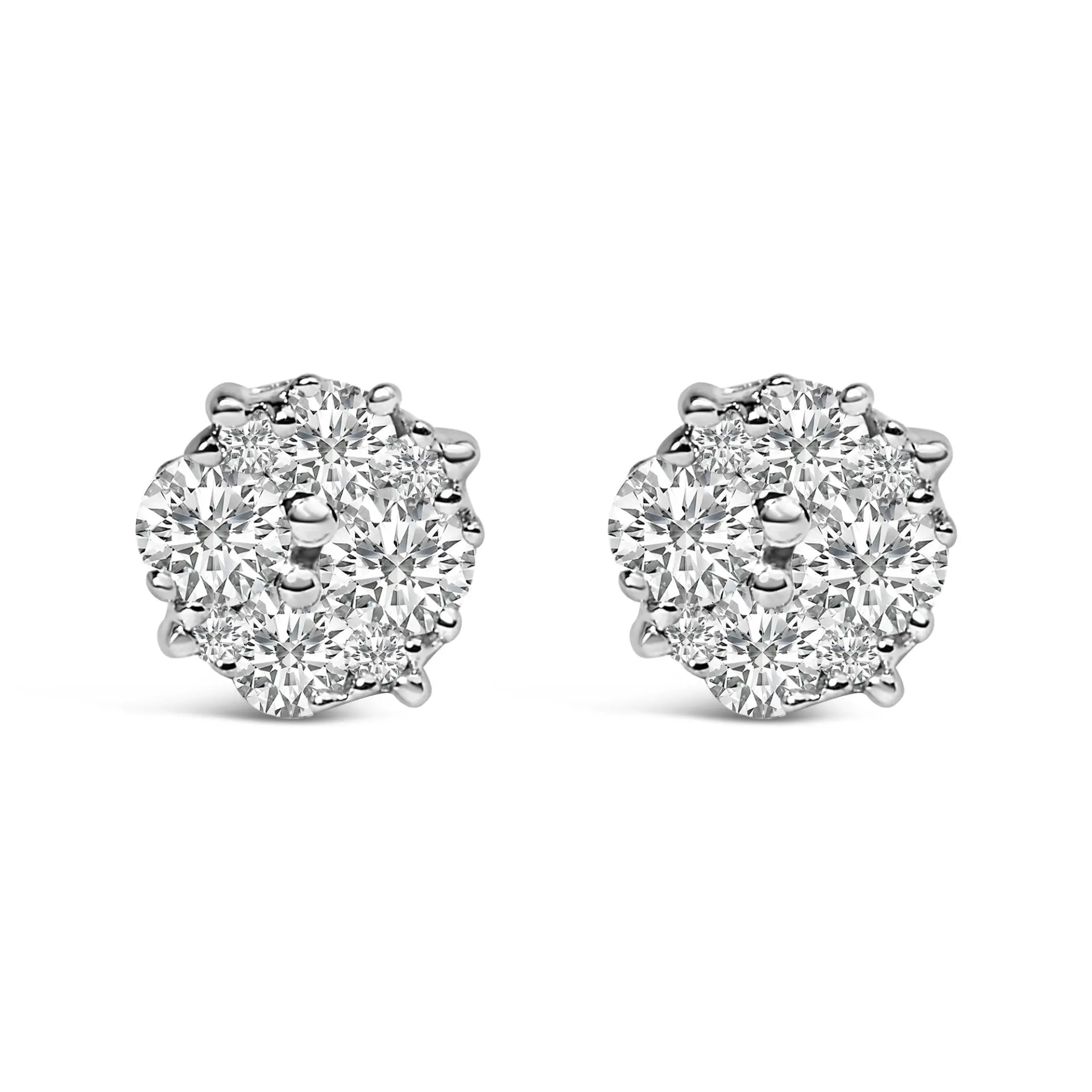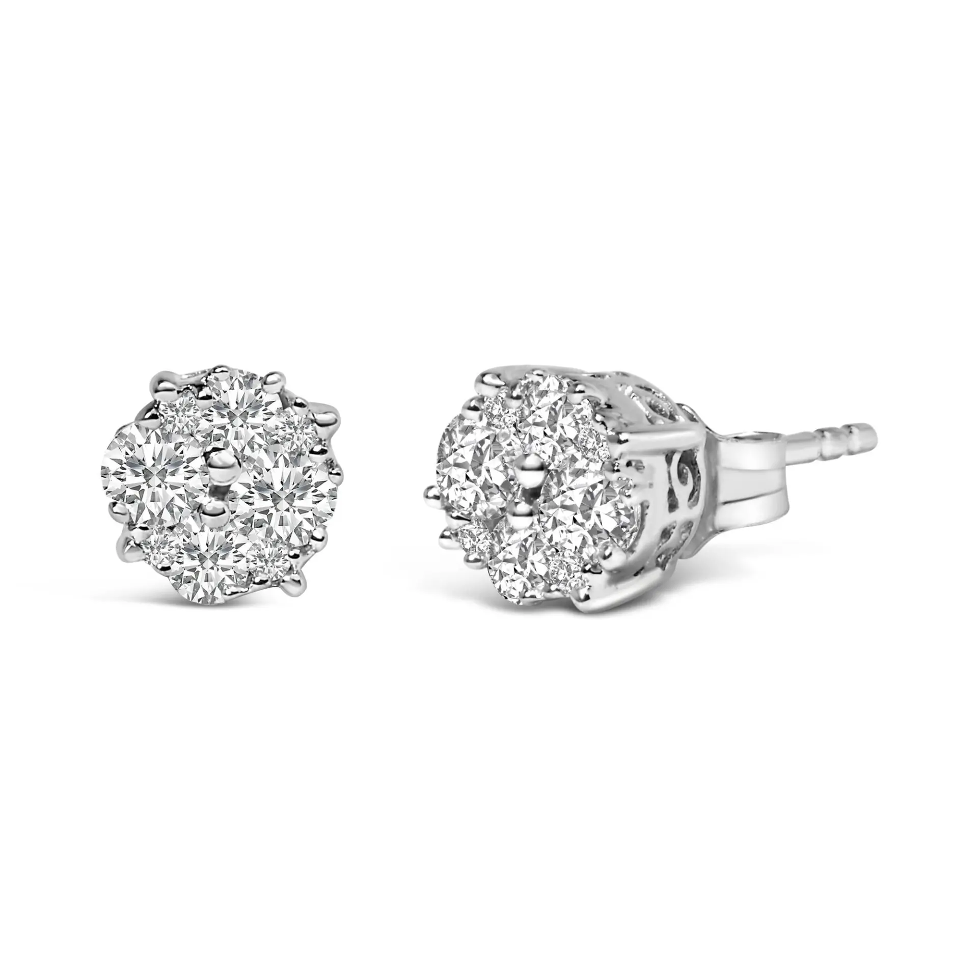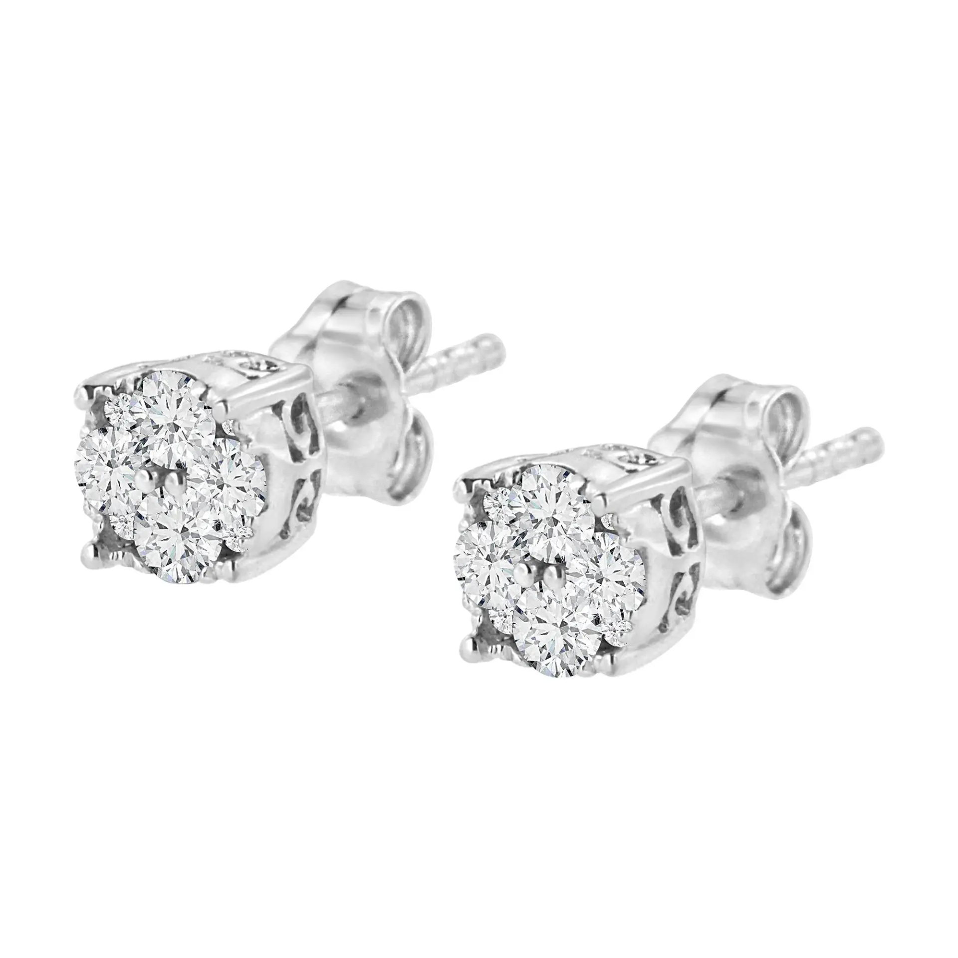 Elegant and timeless, these gorgeous 92.5% sterling silver cluster stud earrings feature 0.5 carat total weight of diamonds with 16 individual stones. Four large round brilliant cut diamonds are surrounded with four petite diamonds that fill in the perimeter to make a round cluster composite diamond. This illusion is enforced by the presence of four prominent prongs that look like they are holding one large stone. The earrings feature double notched friction posts with secure butterfly back pushback closures. These classic earrings make a great gift for any special occasion! Diamonds are thought to give the wearer clarity and illuminate solutions to lifes problems, as well as encouraging abundance, strength, courage, harmony, faithfulness, and commitment. These stud style earrings are subtle enough for casual affairs but sparkle in formal settings as well. Coordinate these earrings with your favorite diamond necklace or other diamond jewelry to create a complete elegant ensemble.