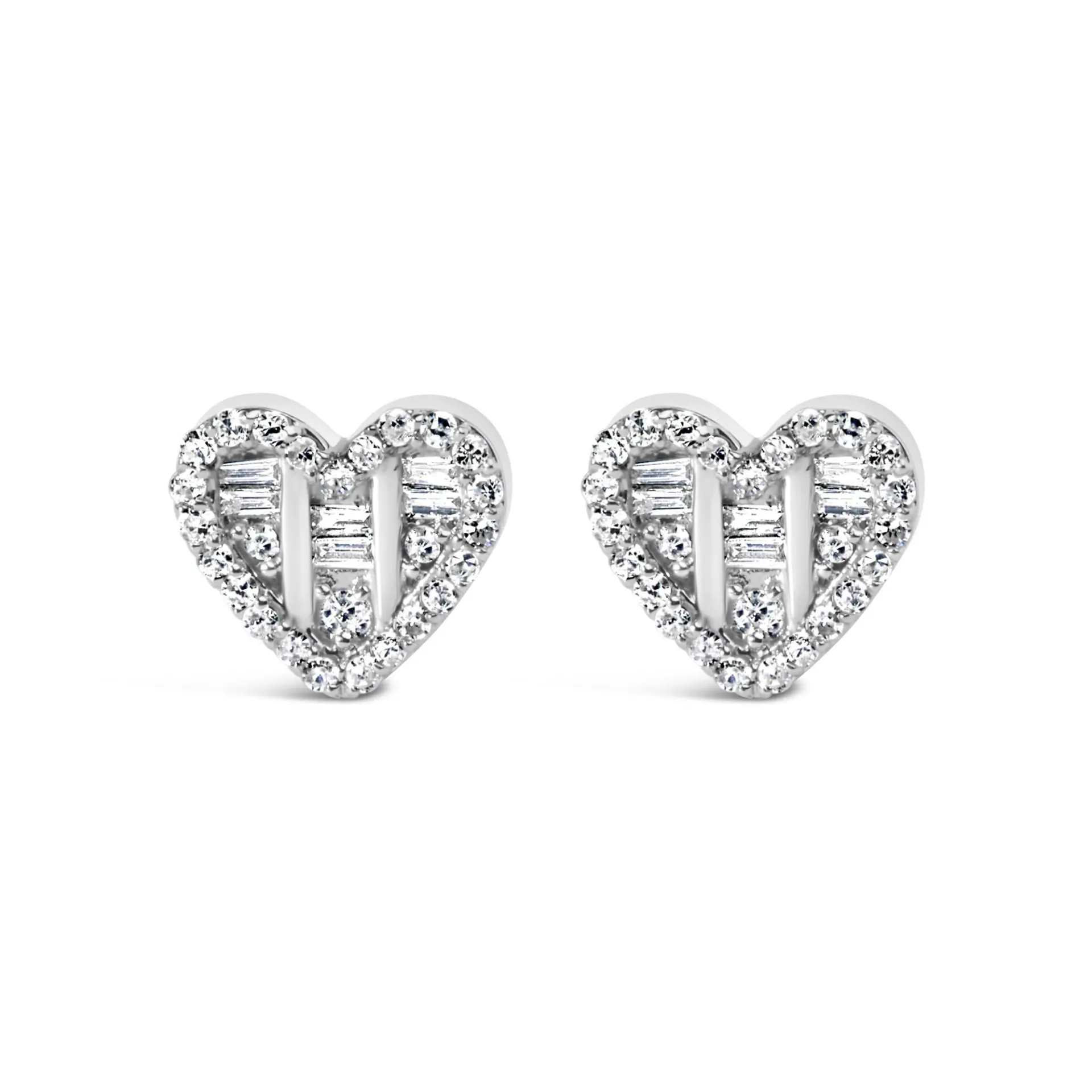 Introducing a mesmerizing masterpiece crafted with love! Delicately designed, these .925 Sterling Silver Stud Earrings are adorned with a captivating composition of round and baguette diamonds. With a total weight of 1/2 cttw and 62 dazzling diamonds, these earrings will effortlessly elevate your style. The heart-shaped studs symbolize affection, making them a perfect gift for that special someone. The prong and channel setting ensures the diamonds stay securely in place, while the push back findings offer comfort and ease. Suitable for women seeking elegance and grace, these earrings boast a natural diamond origin and a stunning I-J color. The SI2-I1 clarity guarantees a radiant sparkle that will leave everyone enchanted. Embellish your attire with these enchanting earrings and let your inner beauty shine through!