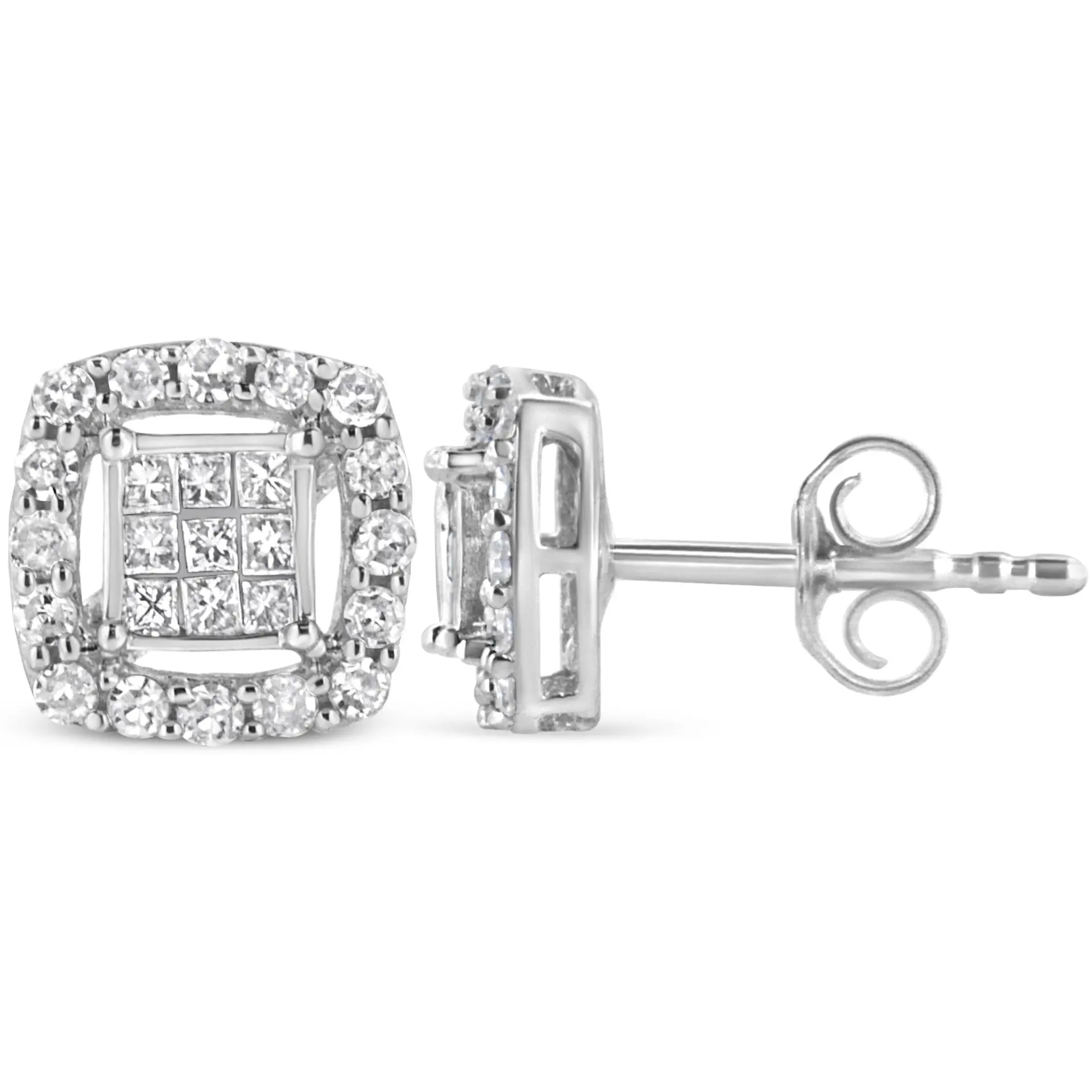 Dazzle with these glamorous stud earrings, uniquely designed with a central square motif embellished with 9 princess-cut diamonds in an elegant prong setting. The central motif is framed by a halo of round-cut diamonds, giving the whole piece a total carat weight of 1/2 cttw. This authentic design is crafted of real 92.5% sterling silver that has been electro-coated with genuine rhodium (a platinum-family metal), a precious metal that will keep a tarnish-free shine for years to come. The push backs keep these pierced earrings safe and secure on your ears for comfortable, wear all day long. Whether for a casual night in or a formal event out, these earrings provide the versatility you’re looking for.