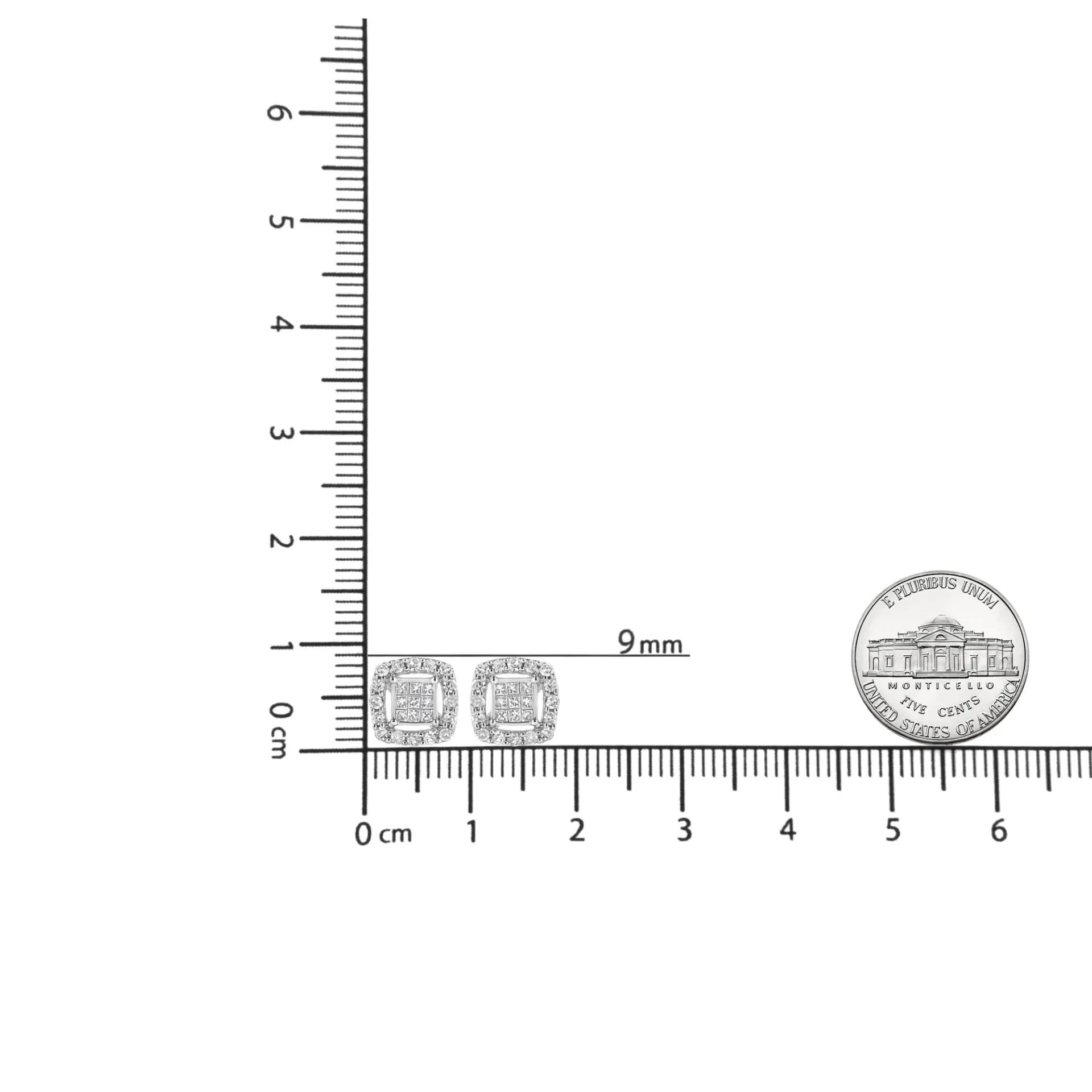 Dazzle with these glamorous stud earrings, uniquely designed with a central square motif embellished with 9 princess-cut diamonds in an elegant prong setting. The central motif is framed by a halo of round-cut diamonds, giving the whole piece a total carat weight of 1/2 cttw. This authentic design is crafted of real 92.5% sterling silver that has been electro-coated with genuine rhodium (a platinum-family metal), a precious metal that will keep a tarnish-free shine for years to come. The push backs keep these pierced earrings safe and secure on your ears for comfortable, wear all day long. Whether for a casual night in or a formal event out, these earrings provide the versatility you’re looking for.
