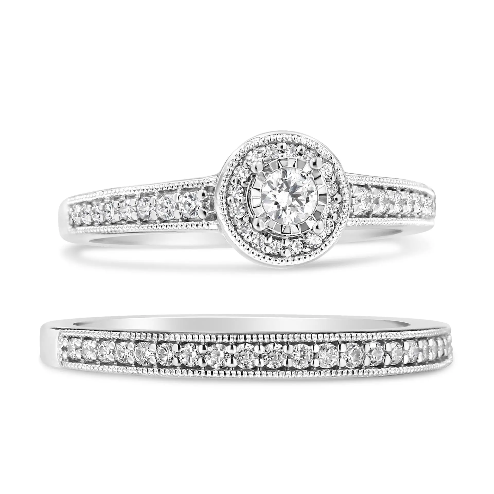 Immerse yourself in the sheer elegance of this bridal set, beautifully crafted from rhodium-plated .925 sterling silver that promises not only a brilliant shine but enduring quality. Central to the engagement ring is a resplendent 1/8 ct natural diamond, brilliantly showcased by a miracle plate to enhance its luminosity and allure. Encircling this precious gem is a halo of sparkling diamonds, each meticulously set to catch the light from every angle, and bordered by the vintage-inspired charm of milgrain detailing. This artful design continues along the shank with pave-set diamonds, each bordered by the same intricate milgrain, ensuring the ring dazzles from every view. The complementary wedding band mirrors this romantic design, featuring pave-set diamonds with fine milgrain edging, harmonizing splendidly with the engagement ring. This set not only symbolizes love and commitment but also reflects a craftsmanship meant to last generations, making it a perfect emblem of your union.