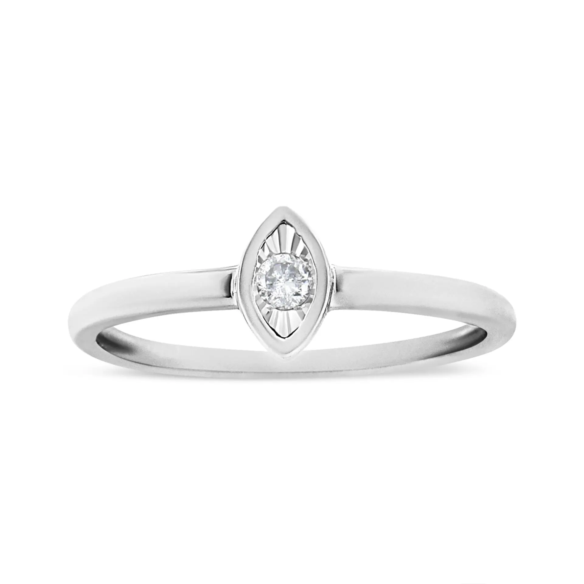 A classic look for the classic girl. Fashioned in stunning sterling silver, this promise ring features a shimmering .05 ct. round diamond solitaire in a unique miracle plate setting for maximum sparkle. The diamond is set in a marquise shaped setting for a unique twist on the traditional promise ring design. This ring is the most elegant way to promise yourself to her. Show your commitment with this diamond promise ring.