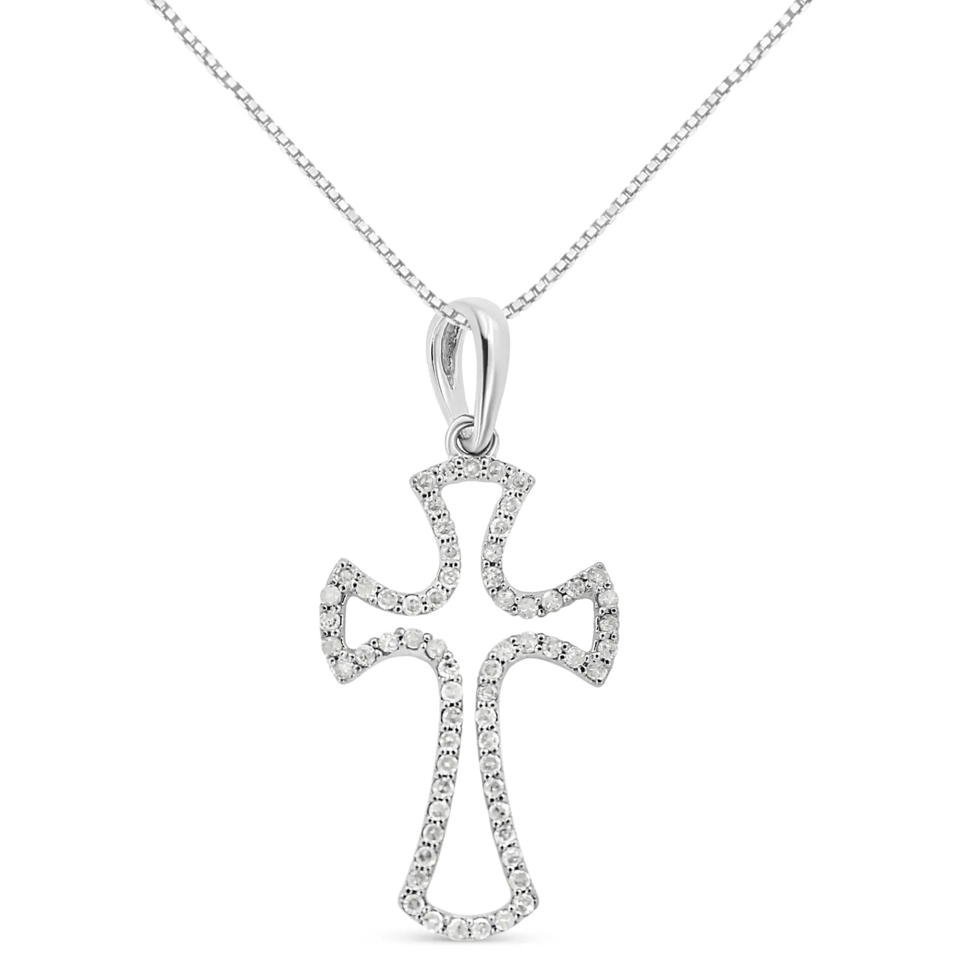 Celebrate your inner spirituality with this beautiful and unique diamond cross pendant. This necklace is designed with an outline of a cross, embellished with a 1/3 cttw of natural, round-cut diamonds. The diamonds are set onto genuine .925 sterling silver, plated with rhodium (a platinum-family metal) for a lifetime of tarnish-free wear. It comes with an 18″ inch box chain. This is the perfect piece to embrace and honor your faith.