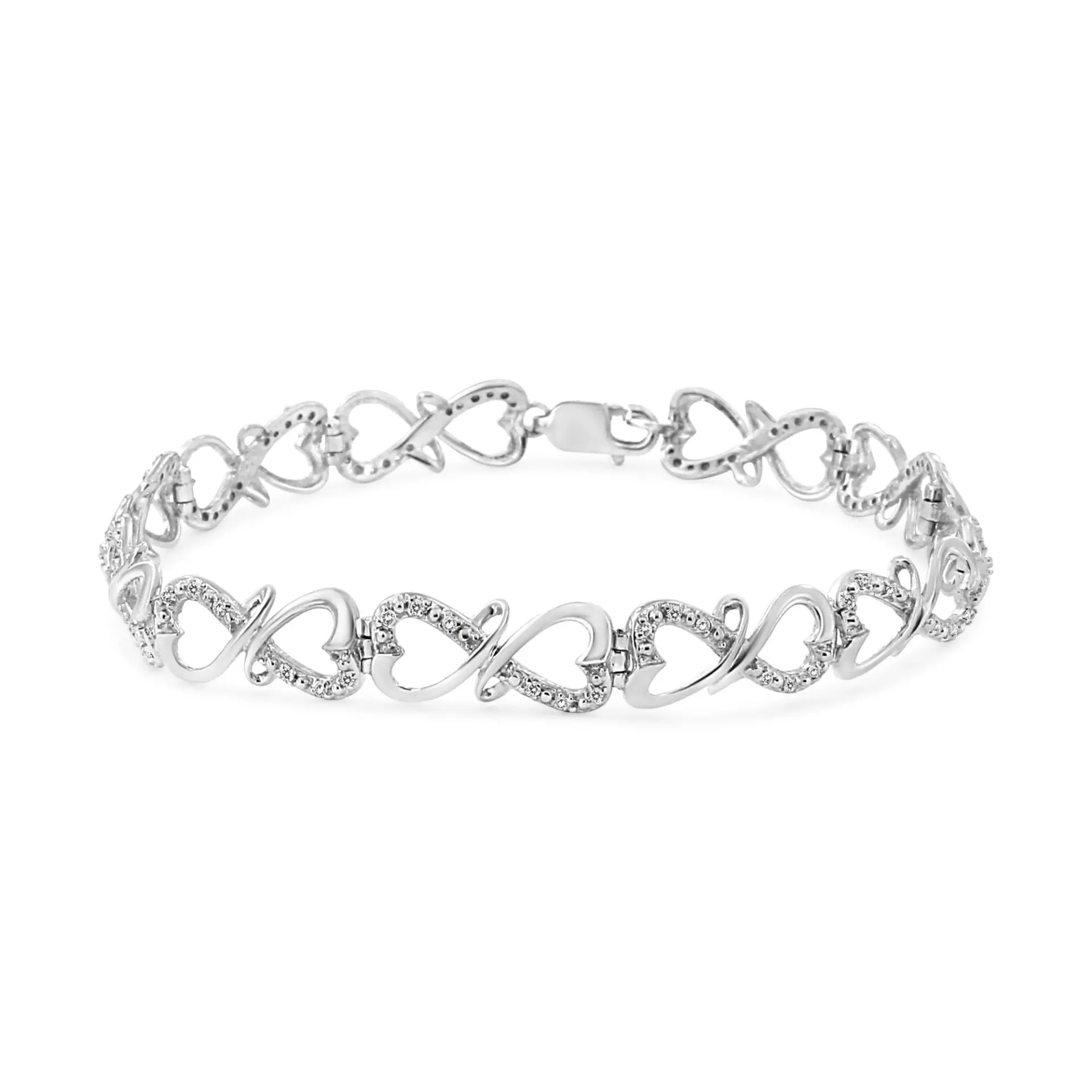 Modern and chic, this beautiful silver bracelet is elegantly crafted with a double heart link design. The metal is genuine .925 sterling silver, ensuring it will stay tarnish free for years to come. The double heart links are intricately embellished with natural, round-cut diamonds in a classic prong setting. The total carat weight of this bracelet is 1/3 c.t. and will add a touch of sparkle to your look. It has a lobster claw clasp mechanism to ensure a safe and secure fit on your wrist.