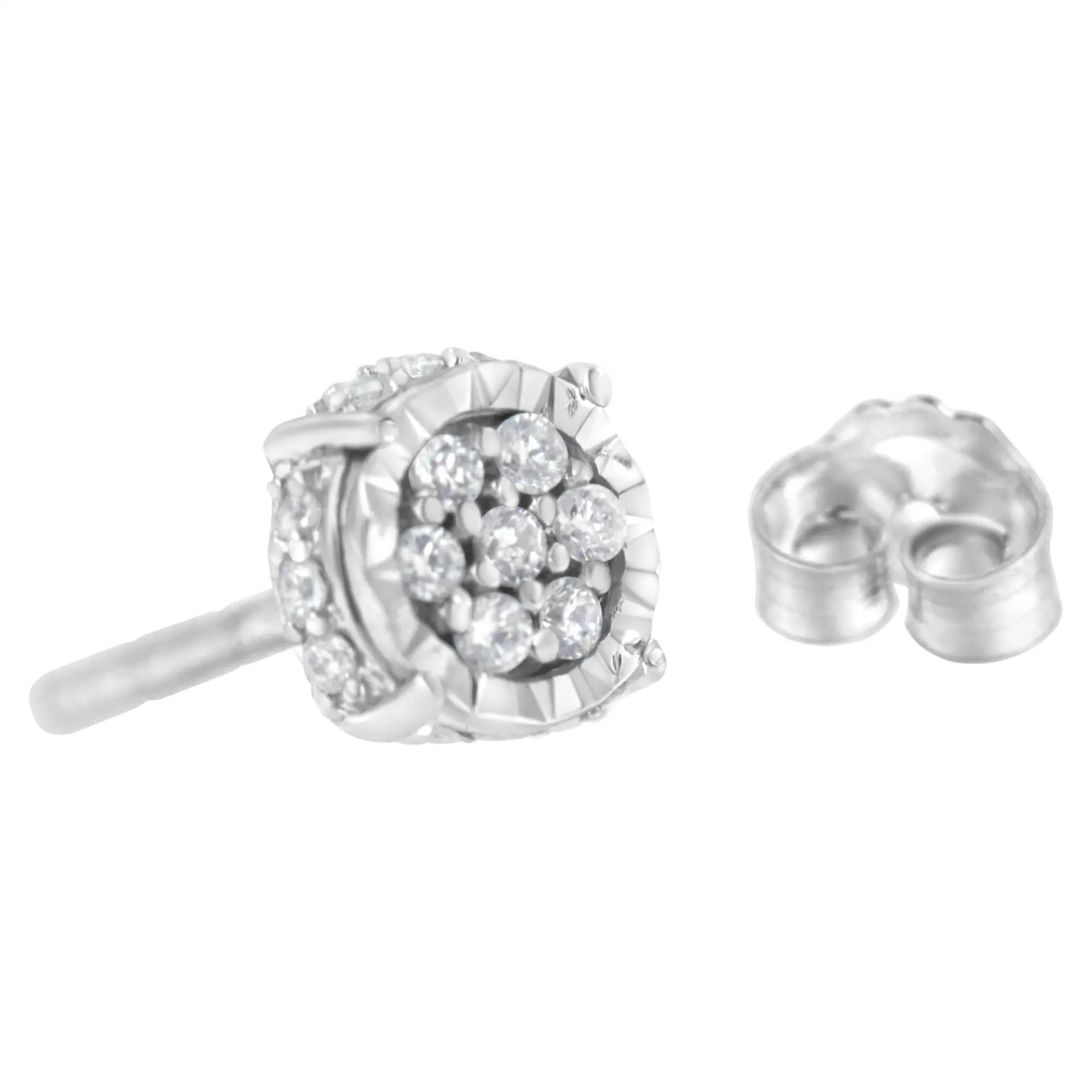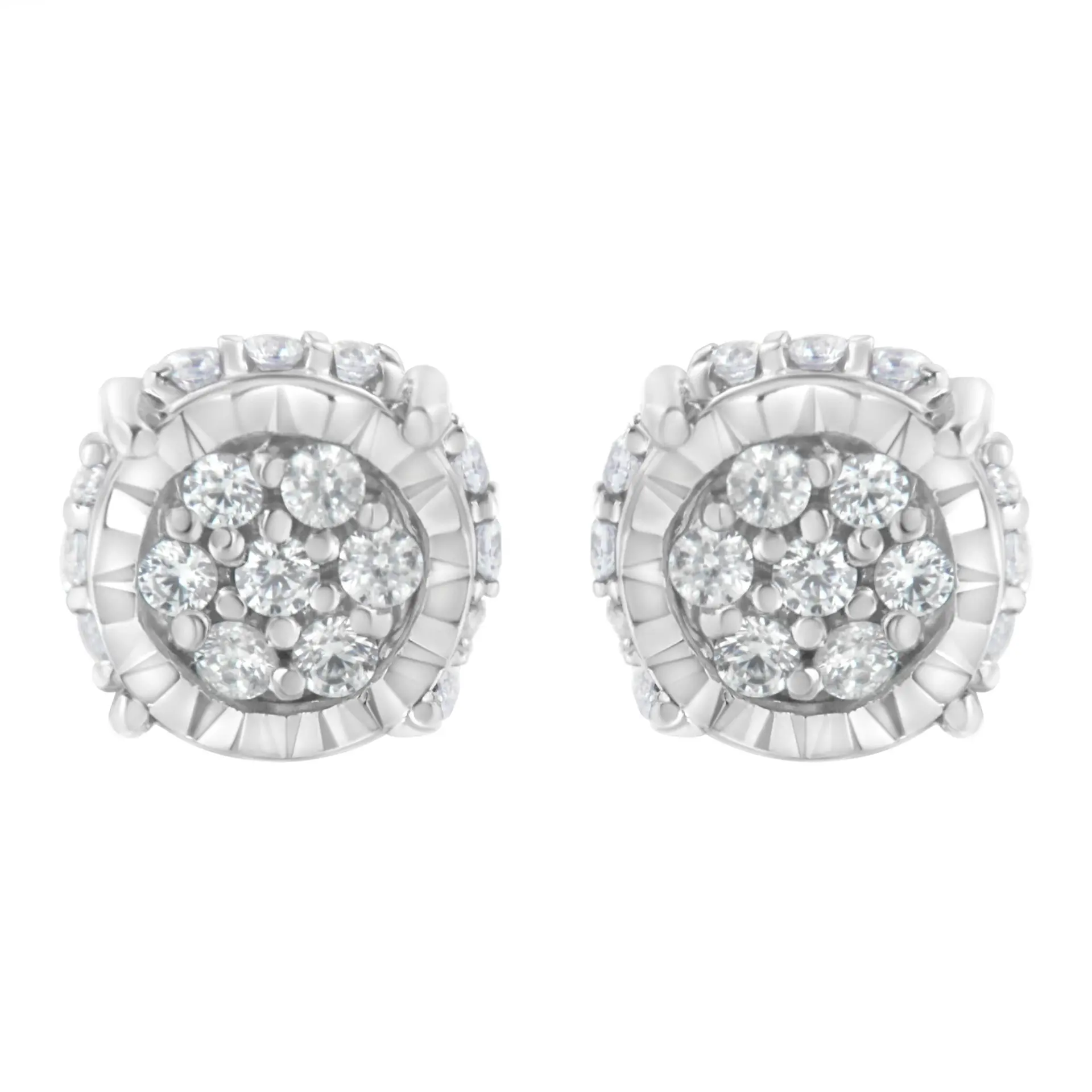 These delicate stud earrings have a unique design. Crafted in sterling silver, these earrings showcase 1/3ct TDW of promo quality diamonds. 7 round cut diamonds sit at the center of a circular stud. Surrounded by a silver halo. Shimmering on the sides of the design additional round diamonds adorn the studs. A push back mechanism keeps the earring secure and you worry free. Promo quality diamonds are on the lowest of diamond color and quality scale. Round-cut, promo quality diamonds are milky and cloudy in nature. They have asymmetrical ball shape and are filled with inclusions.