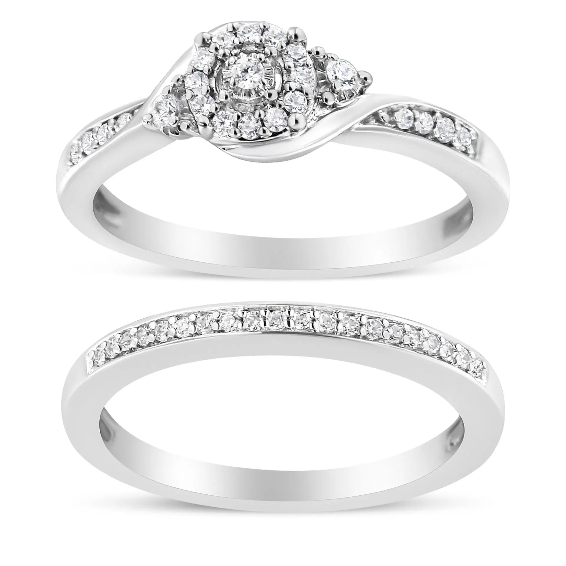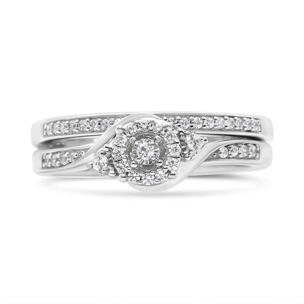 Introducing an exquisite symbol of eternal love and devotion, this .925 Sterling Silver Diamond Halo and Swirl Engagement Ring and Wedding Band Set is a true masterpiece. Crafted with meticulous attention to detail, this set showcases a dazzling array of natural round diamonds totaling 1/4 carat. The 43 diamonds, prong-set in a stunning swirl design, radiate a mesmerizing brilliance that will leave you breathless. The I-J color of the diamonds adds a touch of warmth and elegance, while the I3 clarity ensures a unique sparkle. This set is thoughtfully designed as part of our Elegant Collection, embodying grace and sophistication. With a ring size of 5, it is perfectly tailored for a woman’s delicate finger. Made from .925 Sterling Silver, this set exudes a timeless charm that will last for generations. Ideal for engagements and weddings, this set is a testament to your everlasting commitment. Give your beloved the gift of a lifetime with this enchanting diamond ring and band set.