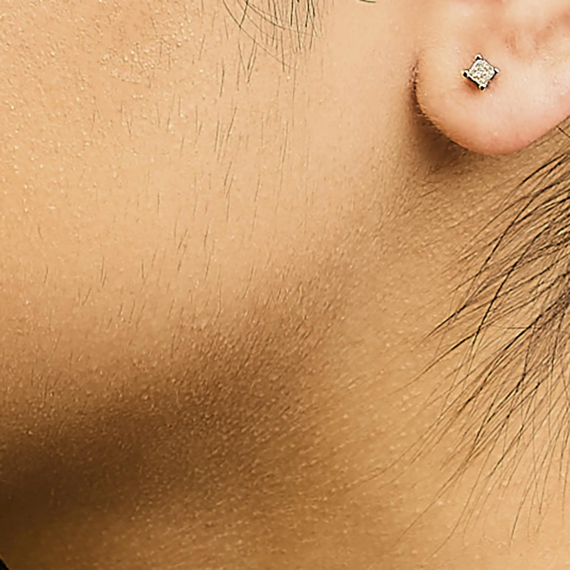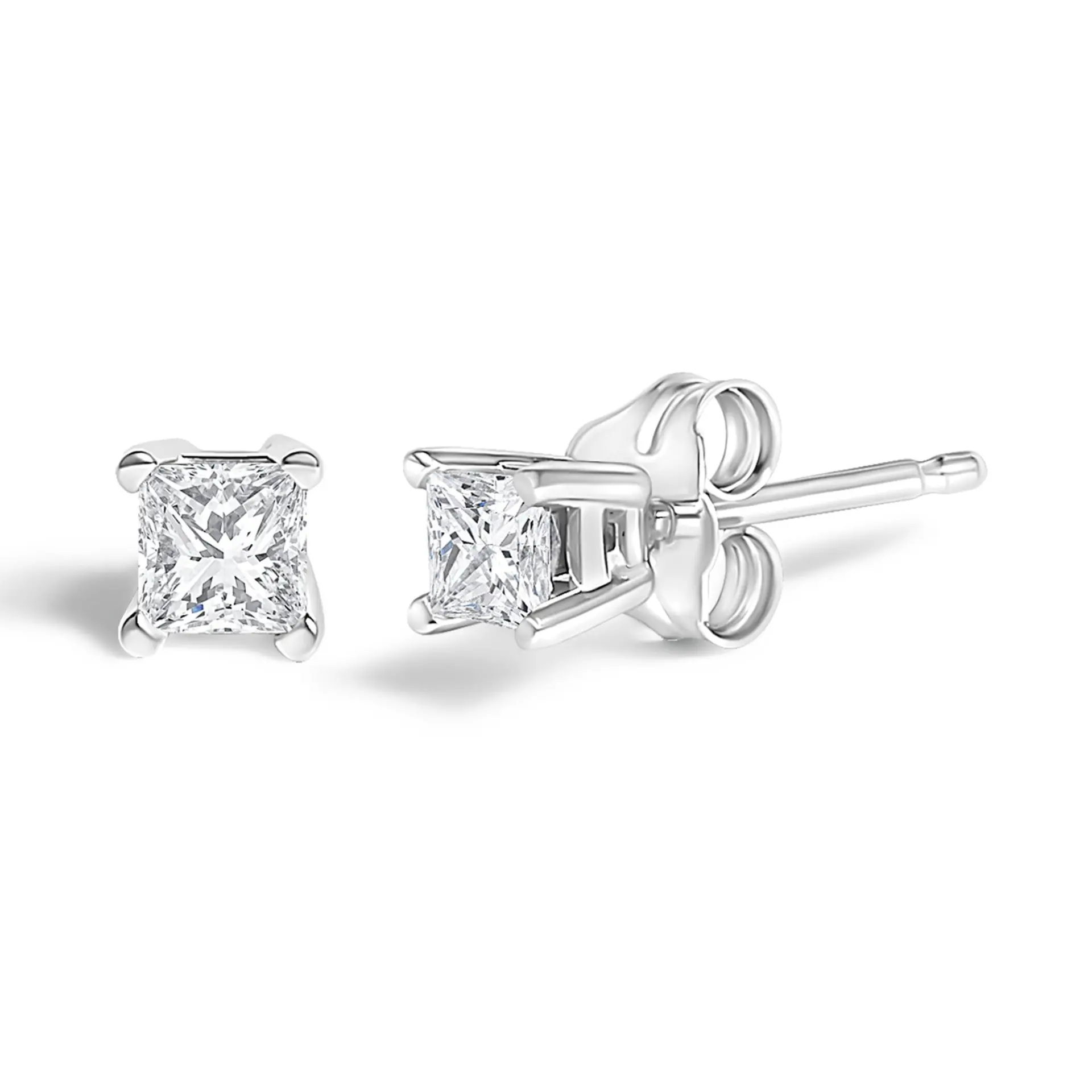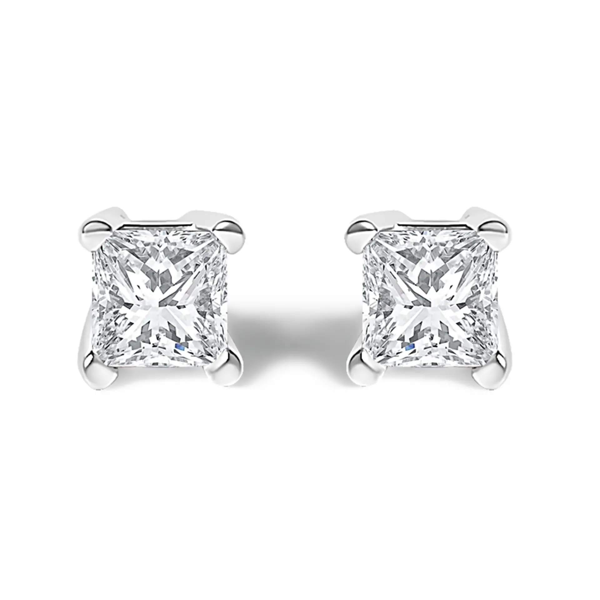 Indulge in the timeless elegance of these splendid stud earrings, meticulously crafted from rhodium-plated .925 sterling silver for enduring brilliance and resilience. At the heart of each earring glimmers a natural, princess-cut diamond, exuding sophistication with its H-I color and I3 clarity. The thoughtful four-prong setting ensures each gem is securely embraced, highlighting its pristine facets and geometric perfection. Designed for effortless grace, these earrings are equipped with push-back closures, providing both comfort and secure wearability. Perfect for daily elegance or as a shining complement to evening wear, they promise to be a cherished addition to any jewelry collection, connecting the wearer to the refined beauty of natural diamonds.