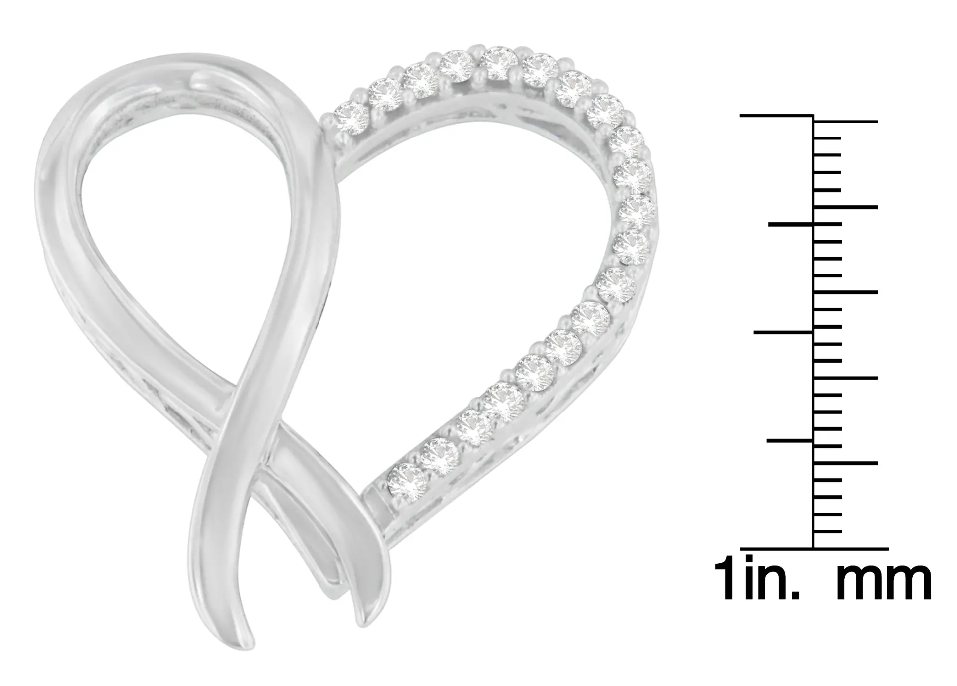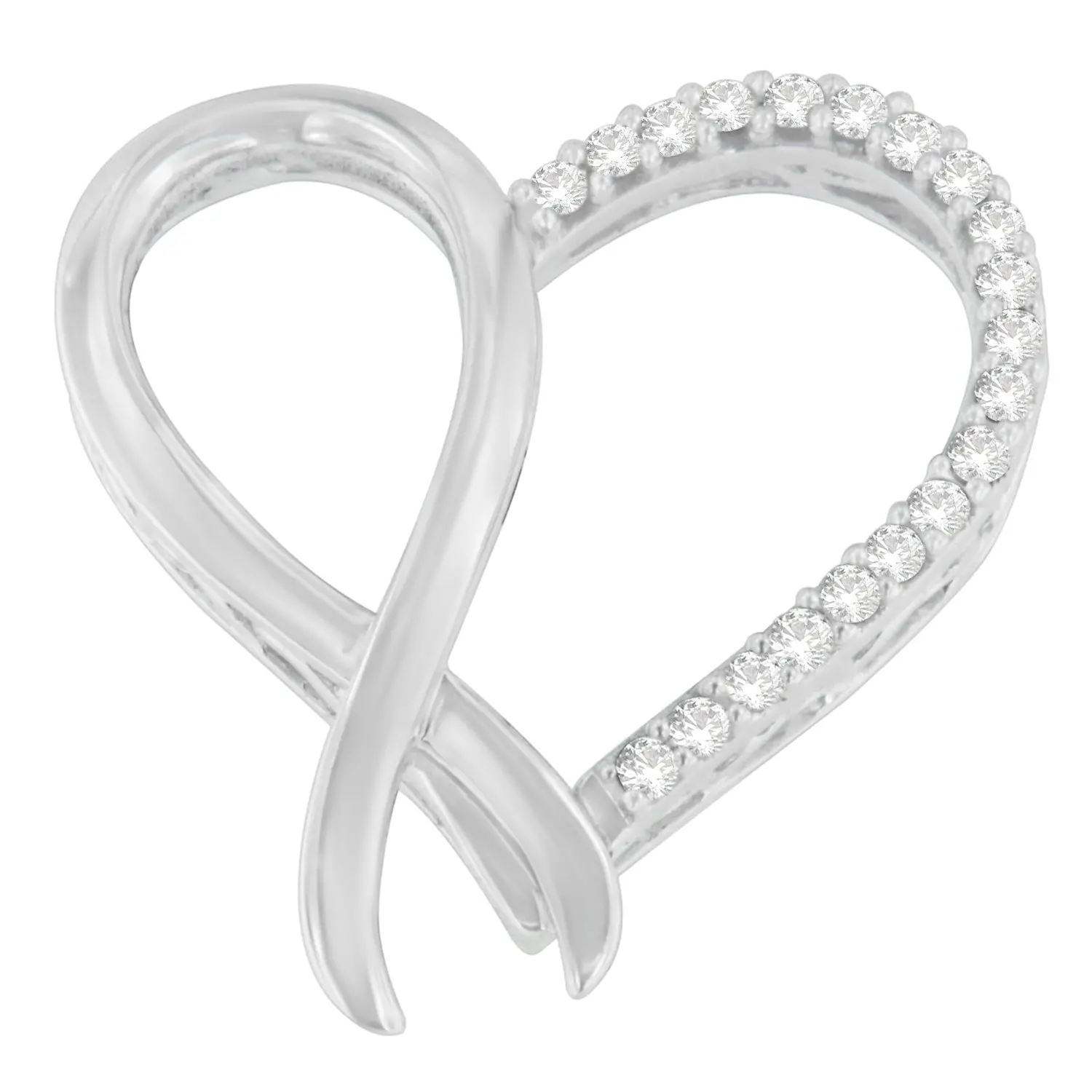Striking the perfect balance of delicate and dramatic appeal, this ribbon and heart accent pendant is composed of sterling silver. The one side of the heart features a beautiful embellishment of prong set round cut diamonds, which makes it eye catchy. Simple in design and classy by look, the pendant will look even more graceful when dangles from the matching chain.