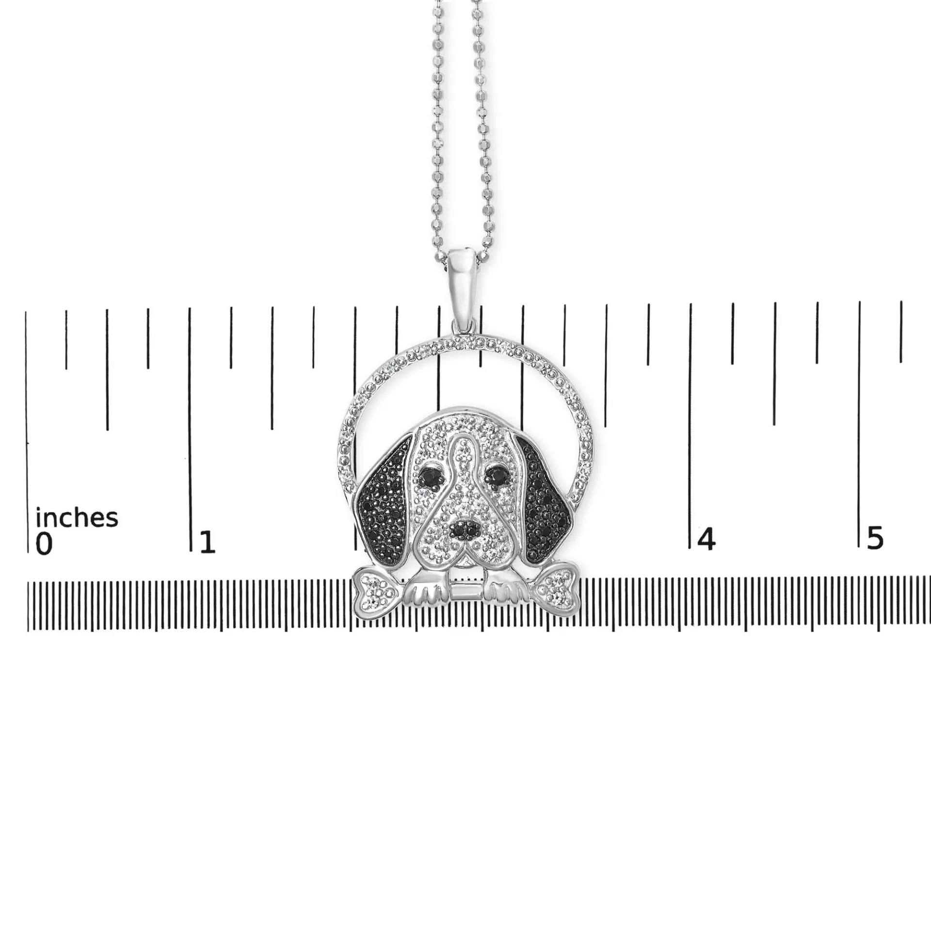 Imbued with playful charm and exquisite craftsmanship, this pendant necklace marries whimsy and luxury. Crafted from rhodium-plated .925 sterling silver, it showcases a delightful beagle motif, each detail sparkling with natural white and treated black diamonds, totaling a quarter carat. The dogs collar dazzles with encrusted gems, while a petite, diamond-adorned bone playfully dangles below. This elegant 18-inch bead chain with a secure lobster claw clasp encapsulates a blend of durability and shine. A perfect gift for dog lovers or a unique addition to a sophisticated collection, this piece promises to enchant, offering a daily sparkle that’s both fanciful and refined.