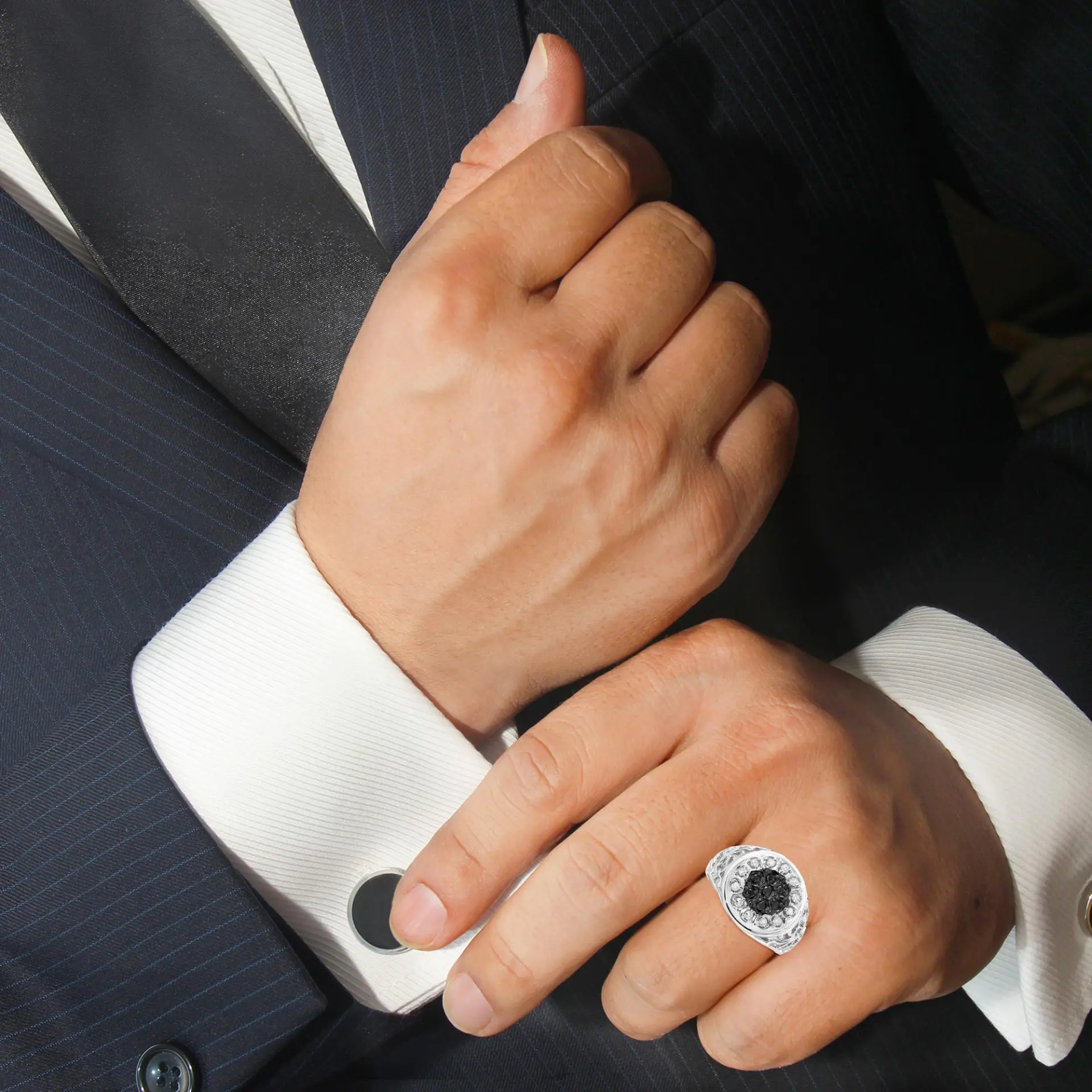 This distinguished cluster ring makes a bold fashion statement, rich with contrasting black and white diamond cluster accents. For this sophisticated design, twelve shimmering white diamonds halo seven black, color treated diamonds in an eye-catching circular motif. Exquisite decorative detailing showcases a gorgeous openwork filigree design along the shank for added appeal. This .925 sterling silver ring is stunning with a total of nineteen 1/4ct TDW, prong-set diamonds with an approximate I3 Clarity. A smart look for all occasions, this striking design will effortlessly complement his suave charm.