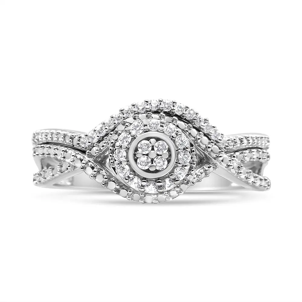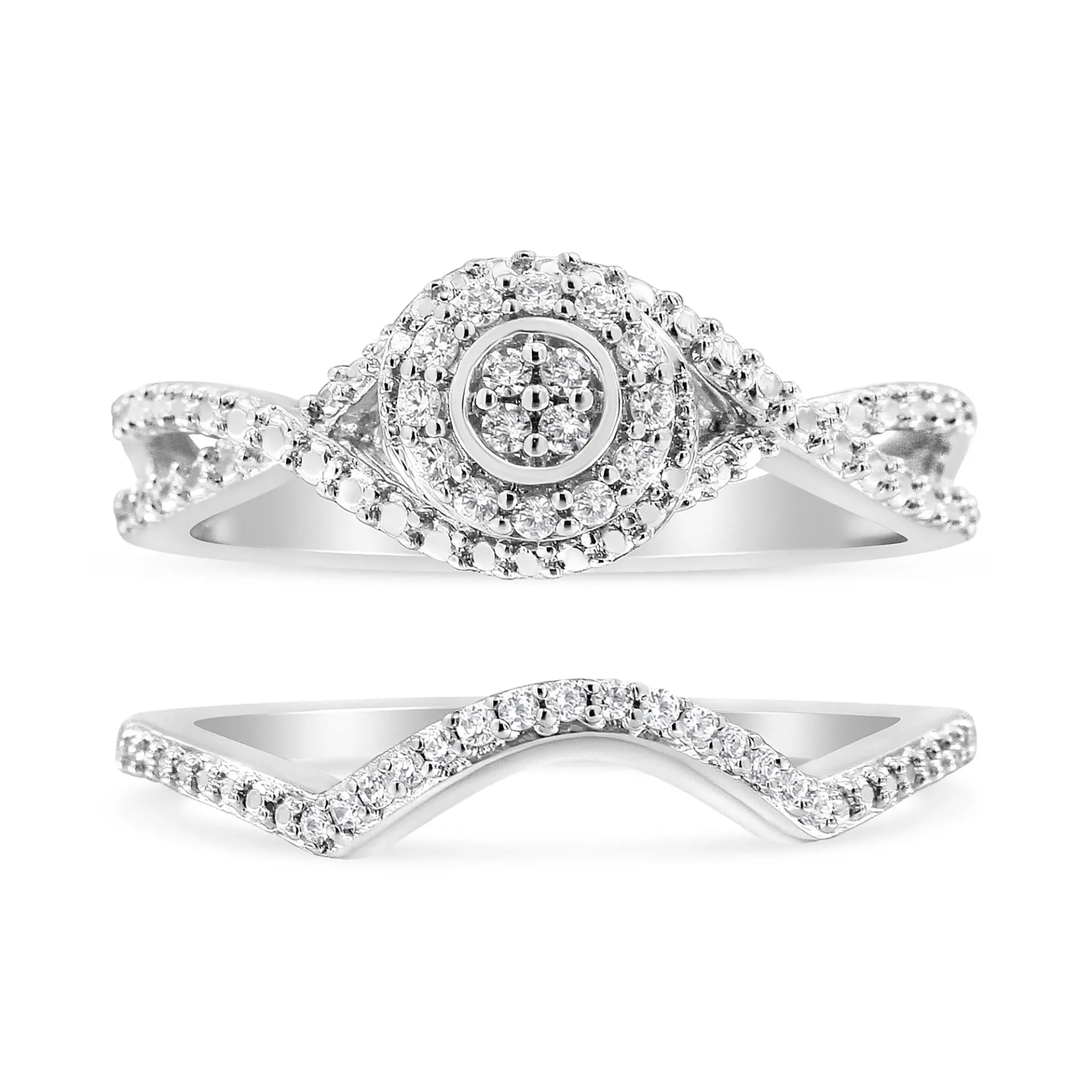 Introducing a mesmerizing masterpiece from our Elegant Collection, this .925 Sterling Silver Bridal Set Ring and Band is an absolute showstopper. Crafted with meticulous attention to detail, this stunning piece features a dazzling composite halo design and a captivating split shank. Adorned with 31 natural round diamonds, totaling 1/6 cttw, this ring exudes an enchanting brilliance. The diamonds, carefully set in prongs, showcase a charming I-J color, while the .925 Sterling Silver with Rhodium Polish adds a touch of elegance. Designed for women who appreciate timeless beauty, this ring is a true symbol of love and commitment. With its exquisite diamond details and alluring design, this bridal set is destined to make hearts skip a beat.