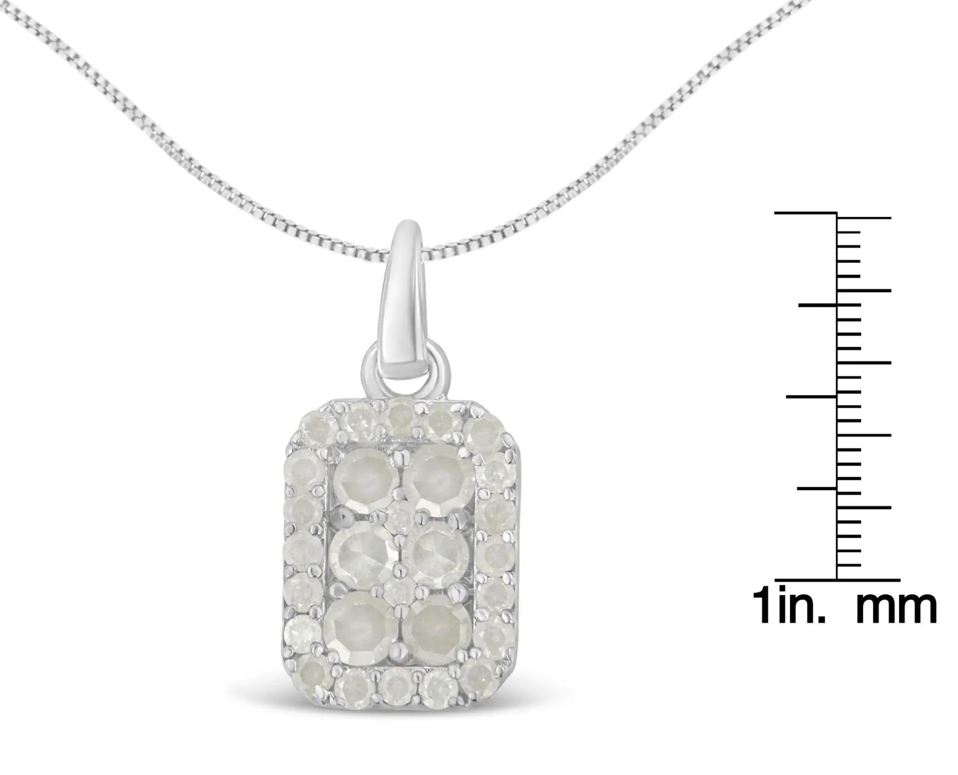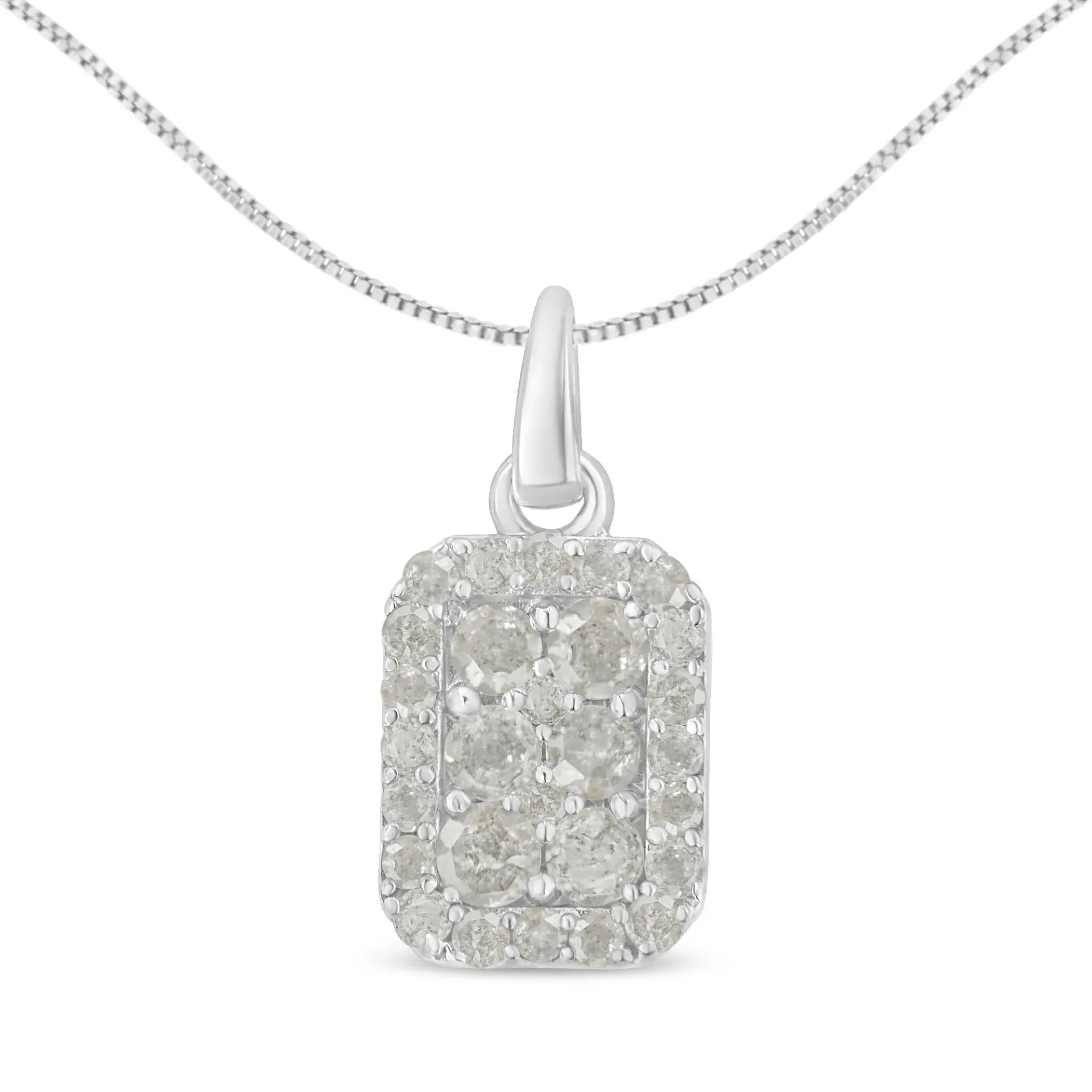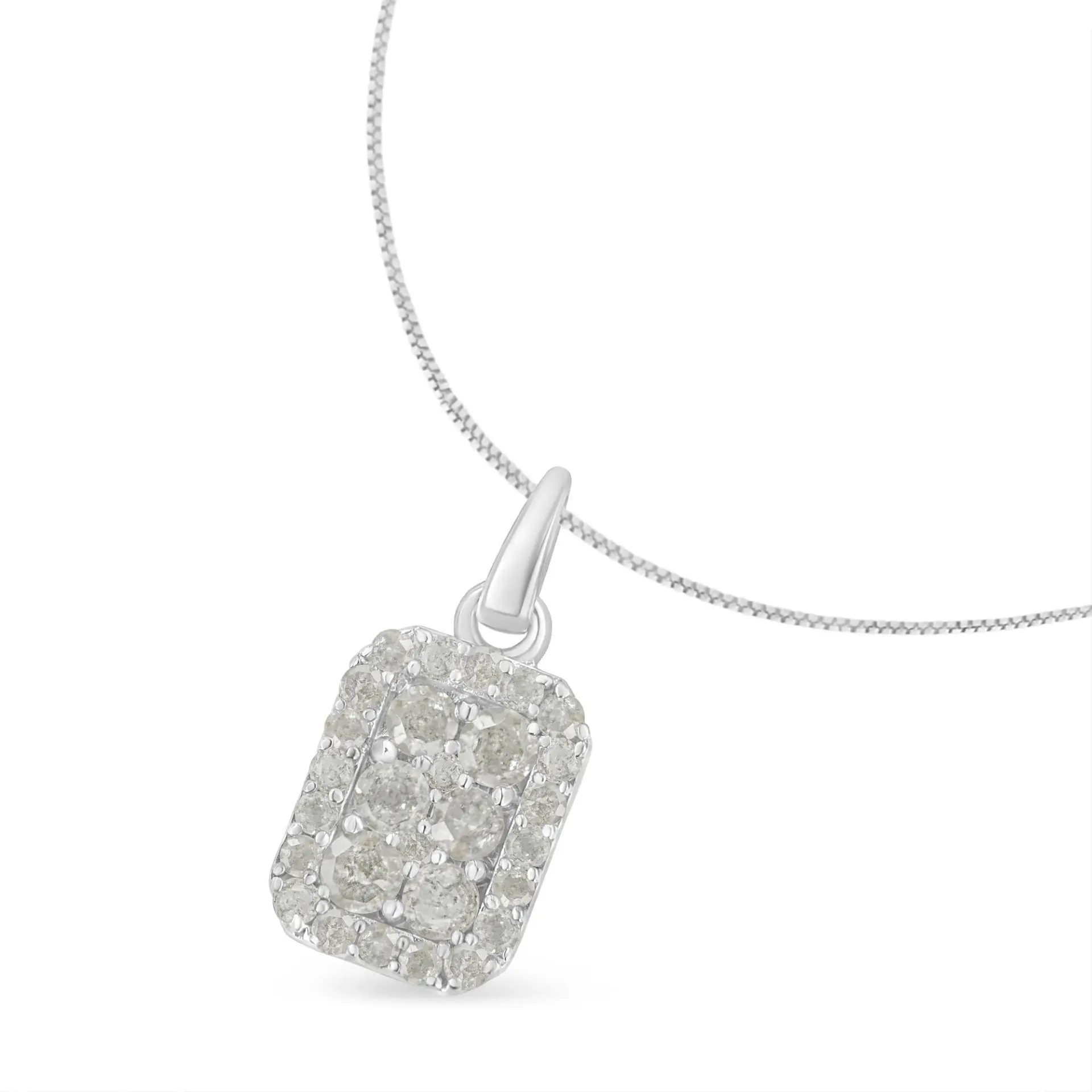 Dress up any outfit with this stunning diamond block pendant necklace. Made from the finest .925 sterling silver, this piece is embellished with 28 genuine diamonds in a prong setting. This is a 1 ct tdw piece that is perfect for any occasion – casual or formal. The chain is a box type and is 18 inches long. It’s the perfect addition to any woman’s fine jewelry necklace collection. The diamonds are natural, rose-cut, IJ color, and I3 clarity, which puts them at the lower end of the diamond color and clarity grading scale. Rose-cut, promo quality diamonds are milky and cloudy in nature. They have an asymmetrical ball shape and are filled with inclusions.