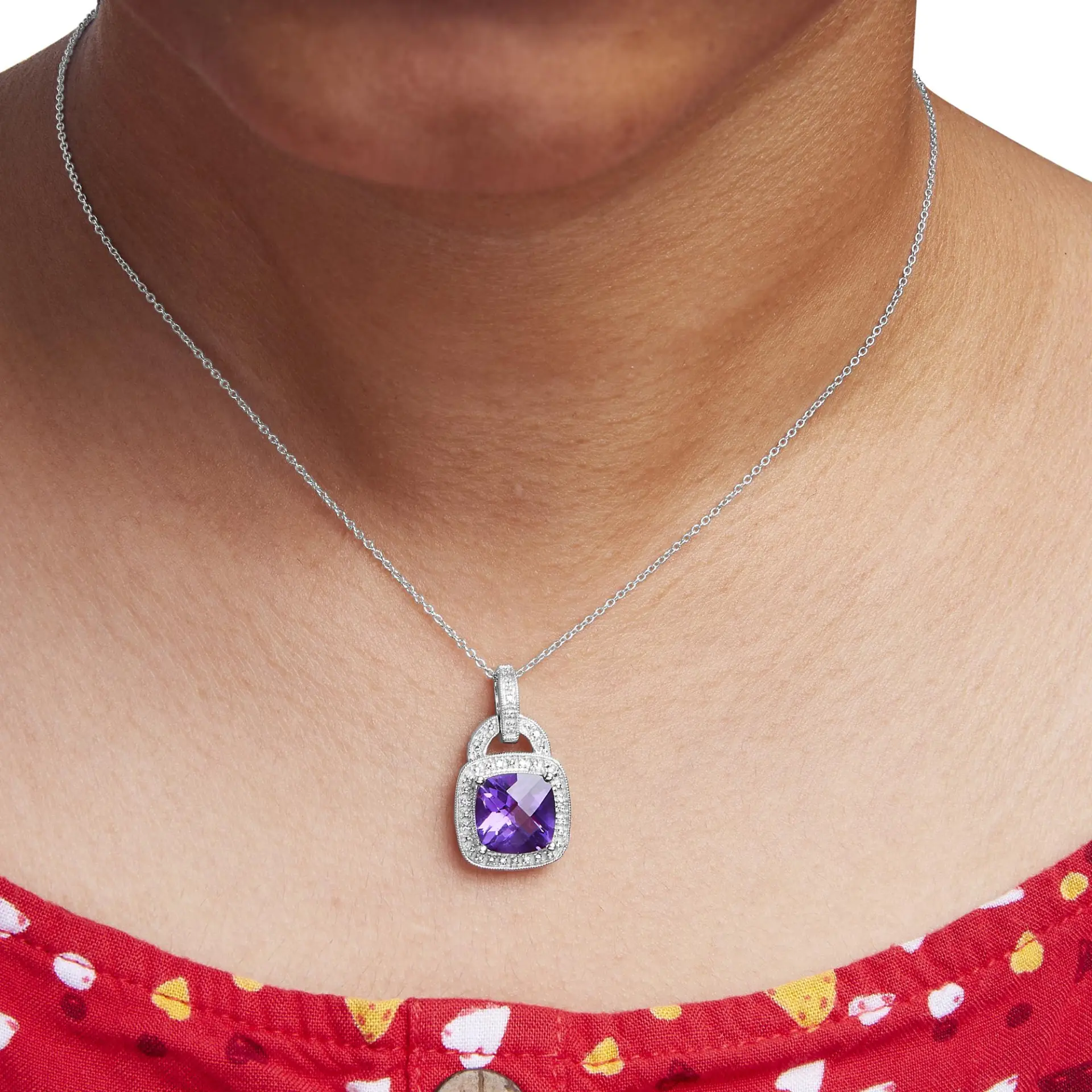 Suspended in splendor, this regal .925 sterling silver necklace features a mesmerizing 10×10 mm cushion-cut purple amethyst, treated to enhance color, its facets catching light with every movement thanks to a stunning checkerboard cut. Natural and inviting, the amethyst centerpiece is enveloped in a luminous halo of diamonds, each selected to harmonize with the gemstone’s royal hue and secured in rhodium-plated silver to enhance their innate sparkle. The diamonds, boasting a clarity of I1-I2 and a color range of I-J, echo the celestial arrangement that circles back to the pendant’s artfully crafted bail. The style concludes elegantly with a slender 18-inch silver cable chain, promising secure placement with a classic spring ring clasp. This necklace serves not just as an accessory but as a testament to timeless craftsmanship and luxury, perfect for elevating any ensemble or occasion.