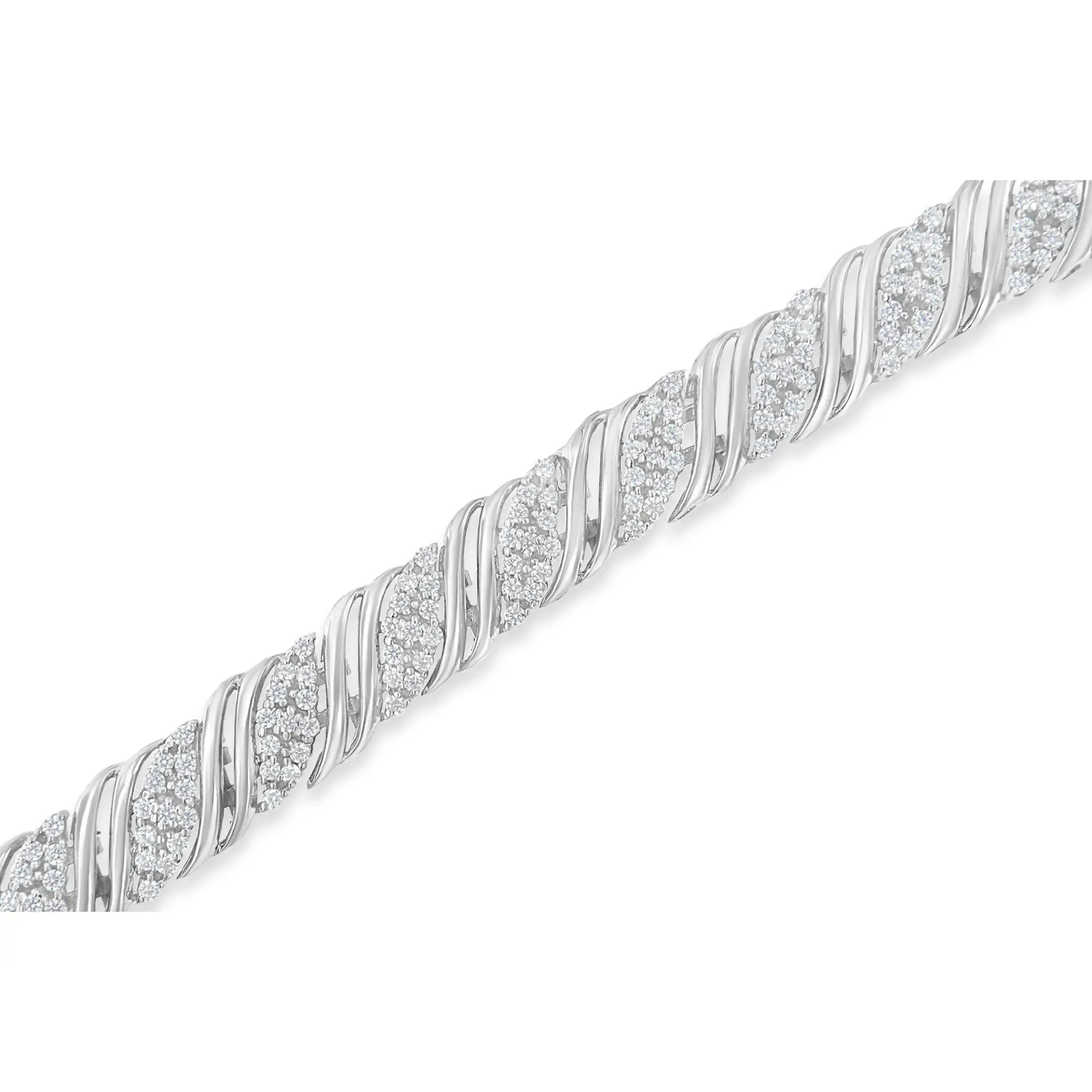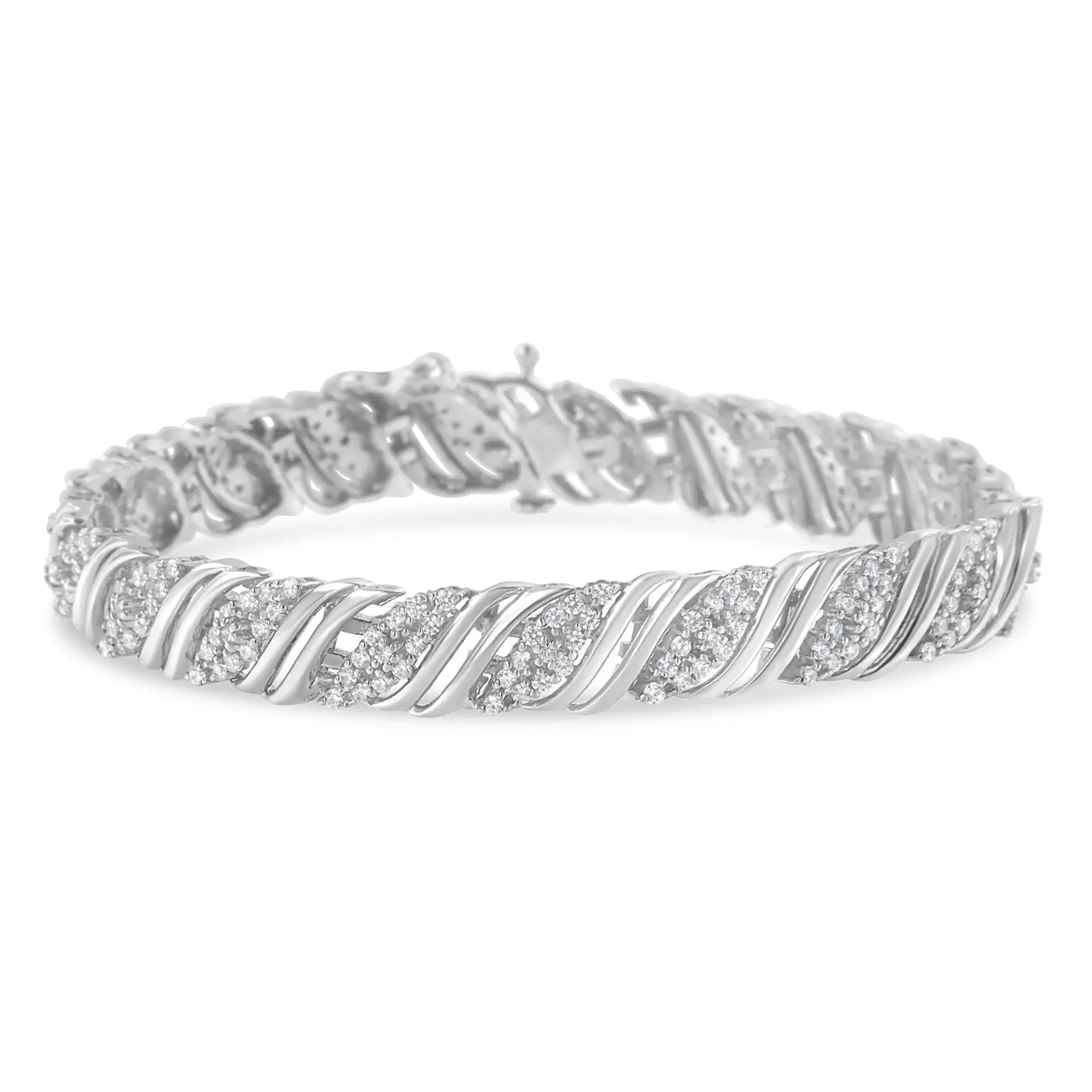 This beautiful sterling silver double wrap bracelet features 2 carats of natural, round-cut diamonds. The piece features an alternating pattern of a cascading design of prong-set diamonds separated by two sterling silver “s” links. This is the perfect addition to any serious jewelry collection. Promo quality diamonds are on the lowest of diamond color and quality scale. Round-cut, promo quality diamonds are milky and cloudy in nature. They have asymmetrical ball shape and are filled with inclusions.