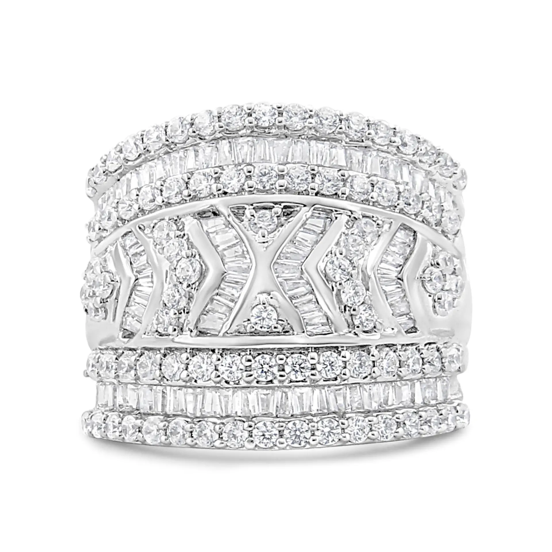 Introducing an exquisite masterpiece, crafted with passion and precision! This .925 Sterling Silver Multi-Row Ring Band is a true symbol of elegance and sophistication. Adorned with a dazzling array of 170 natural diamonds, totaling an impressive 2.0 cttw, this cocktail ring will captivate all who lay eyes upon it. The round and baguette diamond shapes, set in a combination of prong and channel settings, create a mesmerizing dance of light. With a J-K color and I3 clarity, this ring showcases the natural beauty of diamonds. Designed for the confident and glamorous woman, this ring is the perfect accessory to elevate any ensemble. Indulge in luxury and make a statement with this breathtaking diamond edge ring!
