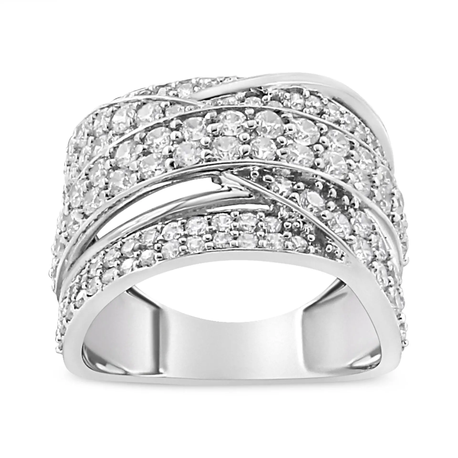 Bold and striking, this glamorous diamond band is crafted from genuine .925 sterling silver, a metal that will stay tarnish free for years to come. Boasting an impressive total carat weight of 2.00 c.t., this ring has bypass, overlapping design embellished with sparkling round-cut diamonds in a classic prong setting. This ring will shine bright on your finger and add a touch of magnificence to your look!