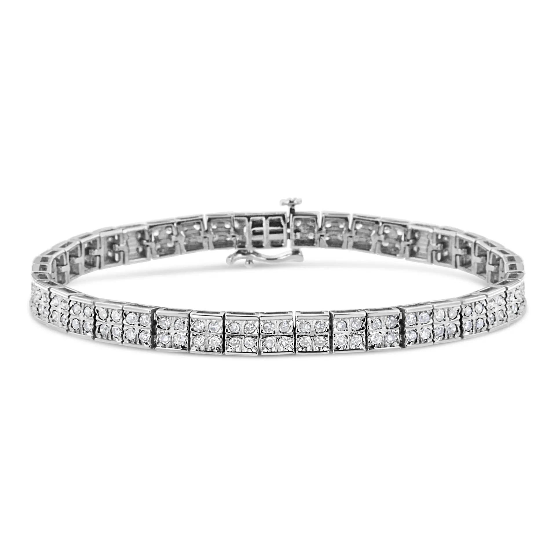 This beautiful link bracelet has a glamorous twist on a classic design. Square silver links are embellished with four stunning round-cut diamonds in an elegant prong setting. This authentic design is crafted of real 92.5% sterling silver that has been electro-coated with genuine rhodium (a platinum-family metal), a precious metal that will keep a tarnish-free shine for years to come. This bracelet has a total diamond weight of 2 carats, and is the perfect accessory for any formal event.