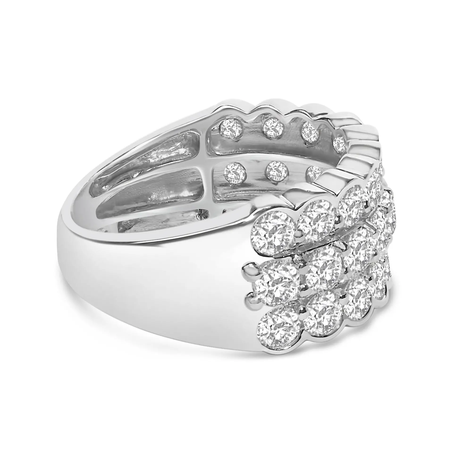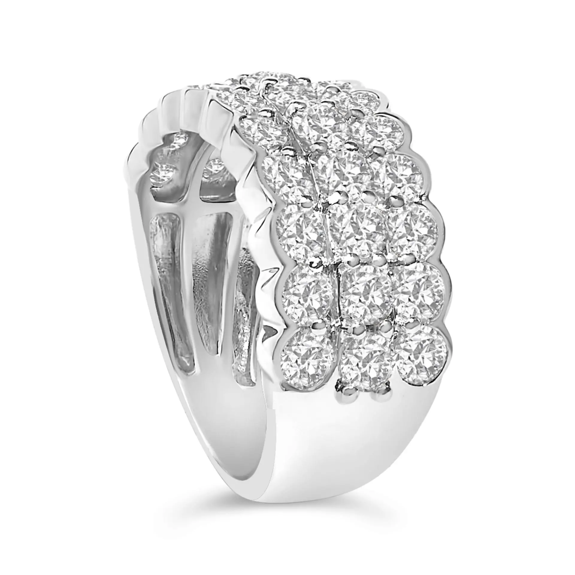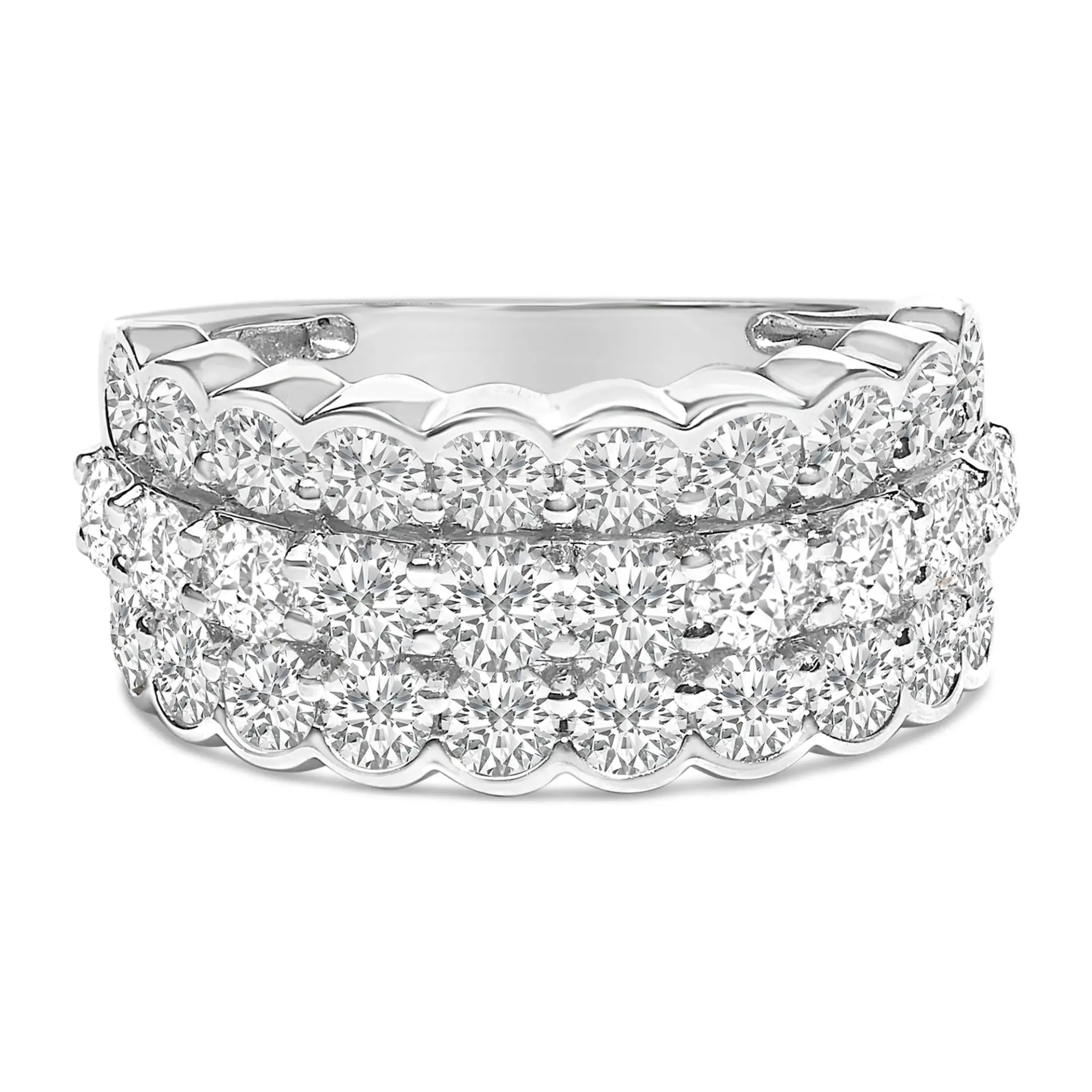 Glistening in a symphony of precision and elegance, this .925 sterling silver ring offers a breathtaking canvas for the twinkling allure of lab-grown diamonds. With a total weight of 3.0 carats, each jewel glimmers in a prong setting that presents them in triadic harmony. Crafted under ethical considerations, these splendid stones display an aura of sustainability and modern craftsmanship. A rhodium plate infuses each curve with robustness and an ethereal sheen, amplifying the stately three-row arrangement and giving the illusion of bezel settings, which further accentuates the brilliance of the diamonds. This piece of adornment isn’t just jewelry; it’s an emblem of grace designed for those who cherish elegance entwined with contemporary ethics.