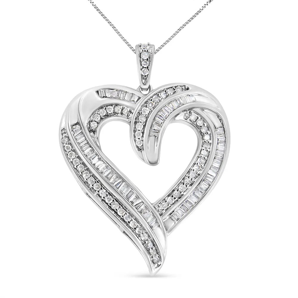 .925 Sterling Silver 3/4 Cttw Round and Baguette-Cut Diamond Open Heart 18″ Pendant Necklace (I-J Color, I2-I3 Clarity)