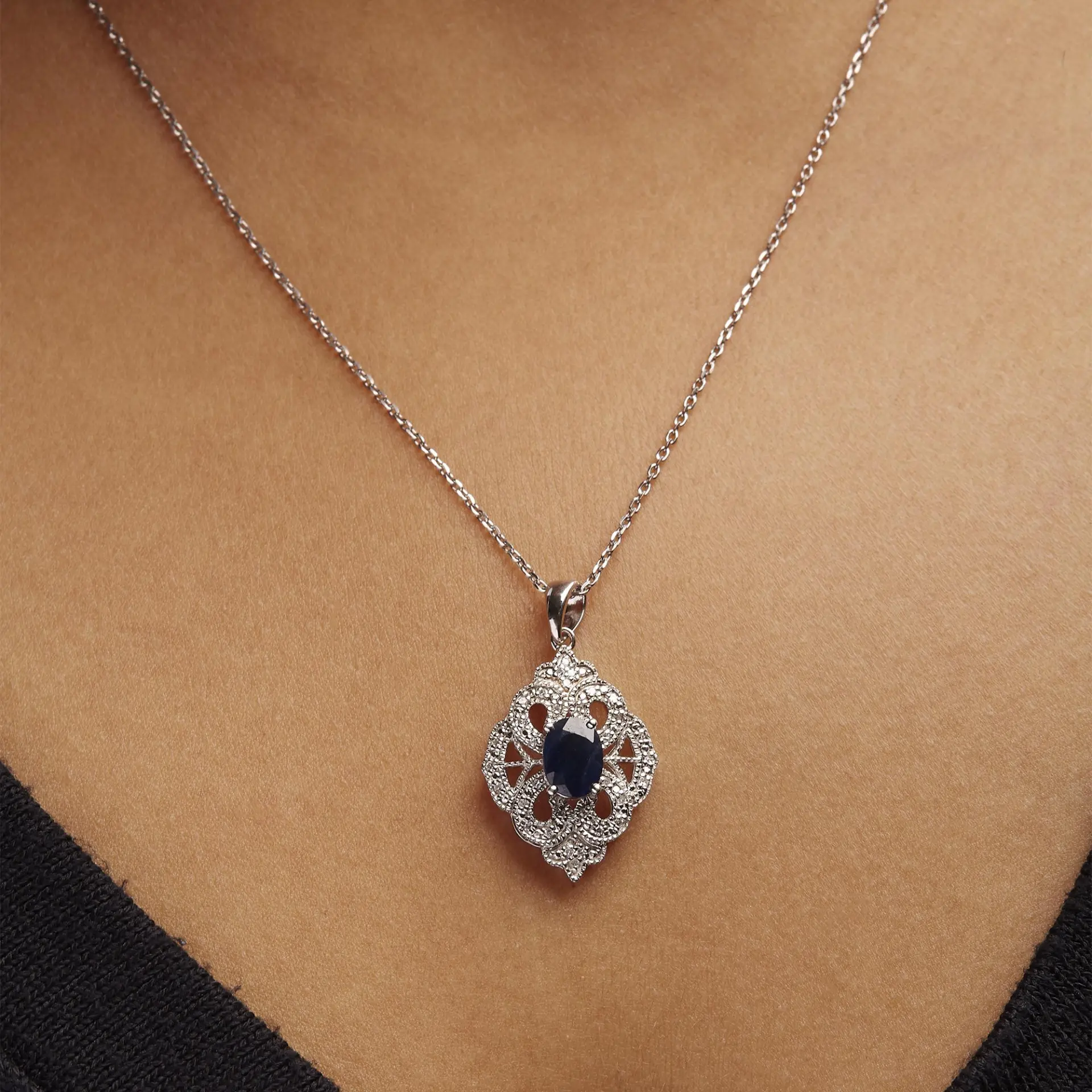 .925 Sterling Silver 7×5 MM Oval Blue Sapphire and Diamond Accent Art Deco Style Shield Shaped 18″ Pendant Necklace (I-J Color, I3 Clarity)