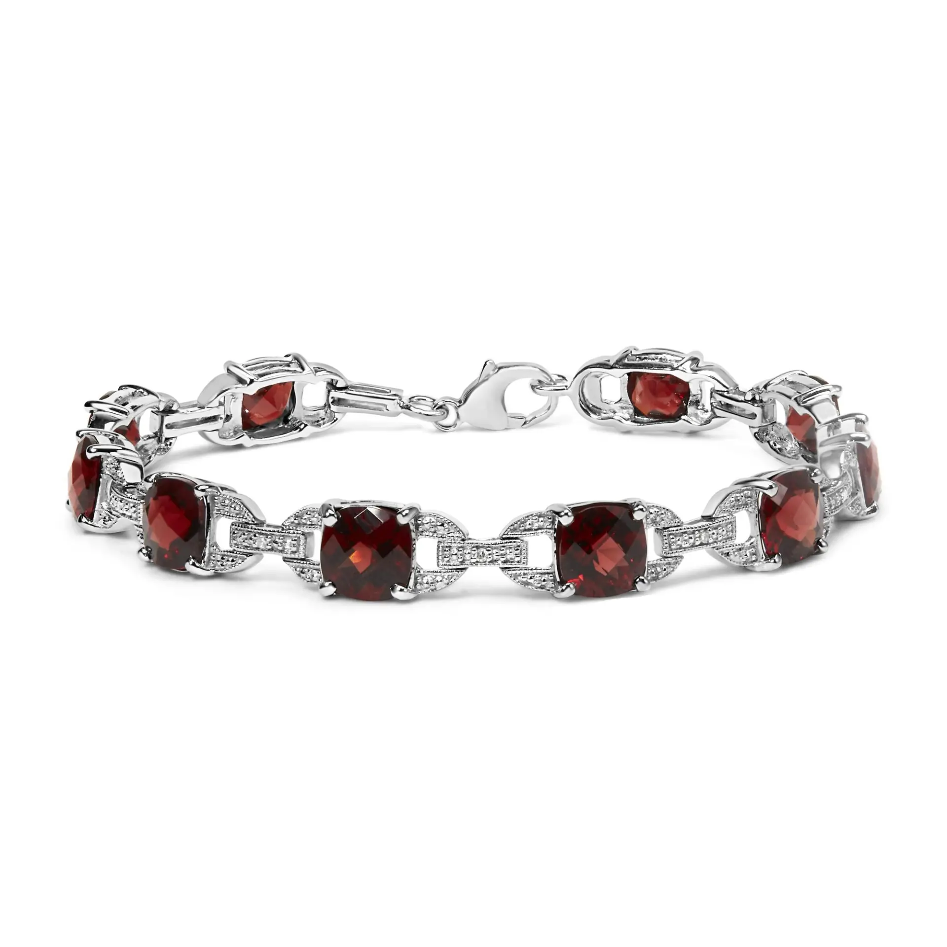 Indulge in the exquisite allure of this captivating .925 Sterling Silver Checkered Cushion Red Garnet and Diamond Accent Fashion Tennis Link Bracelet. Crafted with meticulous artistry, this stunning bracelet features a dazzling array of 10 natural diamonds, elegantly encased in a prong setting. The brilliant red cushion-cut garnet gemstones, measuring 7x7mm, are a true testament to timeless beauty. This bracelet exudes a radiant glow, complemented by the I-J color and I1-I2 clarity of the diamonds. The lobster claw clasp ensures a secure and comfortable fit, while the 7″ inch size is perfect for women. Embrace the allure of this exquisite piece, a testament to your impeccable taste and style.