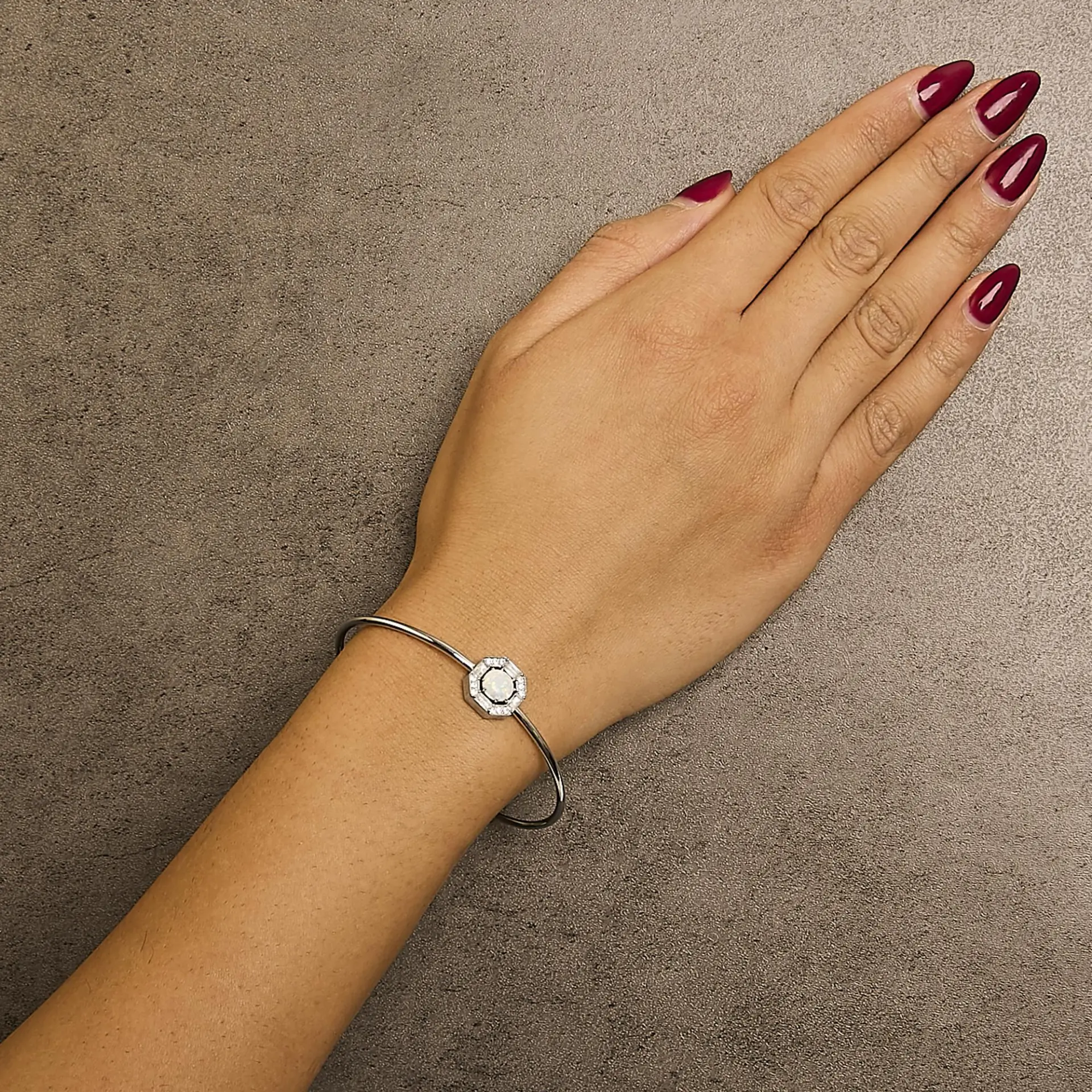 Envelop your wrist in the ethereal glow of this exquisitely crafted bangle, where sophistication and celestial charm fuse seamlessly. Masterfully fashioned from .925 sterling silver, this bracelet parades a polished, slender arc that comfortably hugs wrists up to 7 inches. At the heart of this jewel, a mesmerizing 7×7 mm round created opal gleams with iridescent flashes of color, encapsulated by a brilliant octagonal halo of lab-created white sapphires. These gems sparkle with a clarity only rivaled by a starlet sky, heightening the opulence of the piece. Artfully designed with a unique mechanism, the opal sits securely under the glittering embrace of sapphires, symbolizing protection and allure. Perfect for elevating everyday elegance or adding a splash of glamour to evening wear, this bangle promises to be a beloved treasure in any jewelry collection.