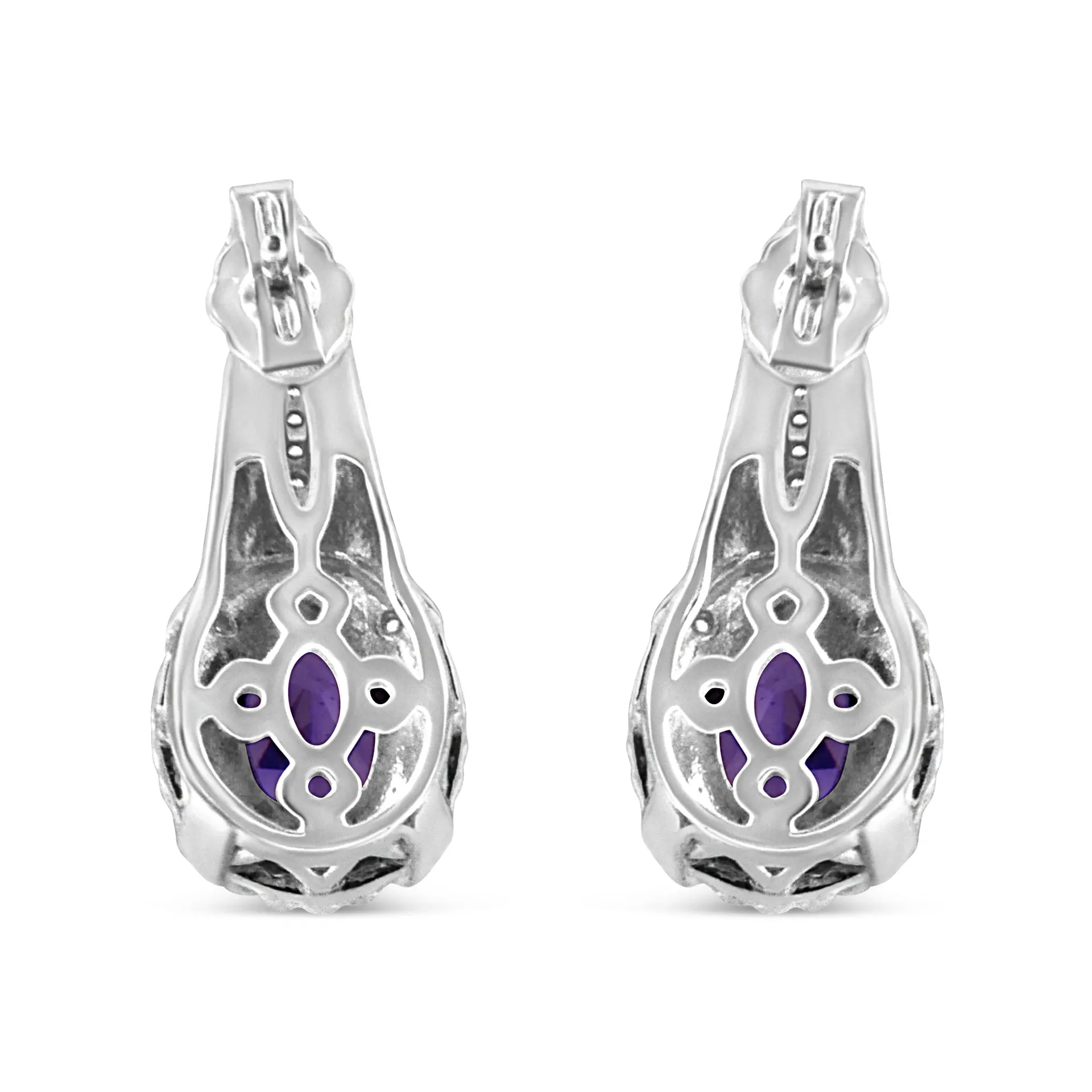 These resplendent amethyst and diamond earrings captures stunning feminine grace. Fashioned in sleek sterling silver, these earrings features a centrally staged oval cut amethyst engrossed by 12 pave set shimmering single cut diamonds embellished by a bright finish rope design on the borders. These treats closes with a secure clasp. Total diamond weight is 1/20 ctw and each amethyst measures 8×6 mm.