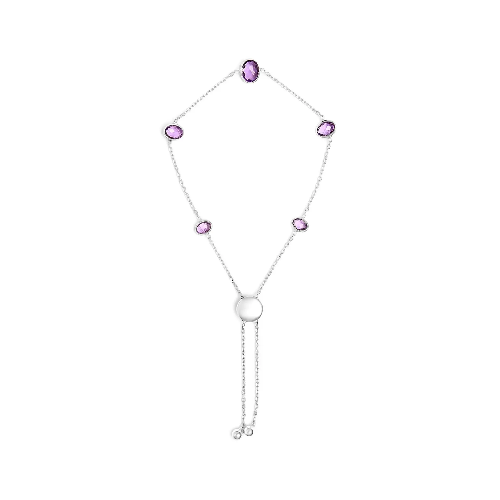Be the first to review “.925 Sterling Silver Bezel Set Purple Amethyst 5 Station Adjustable Bolo Bracelet”