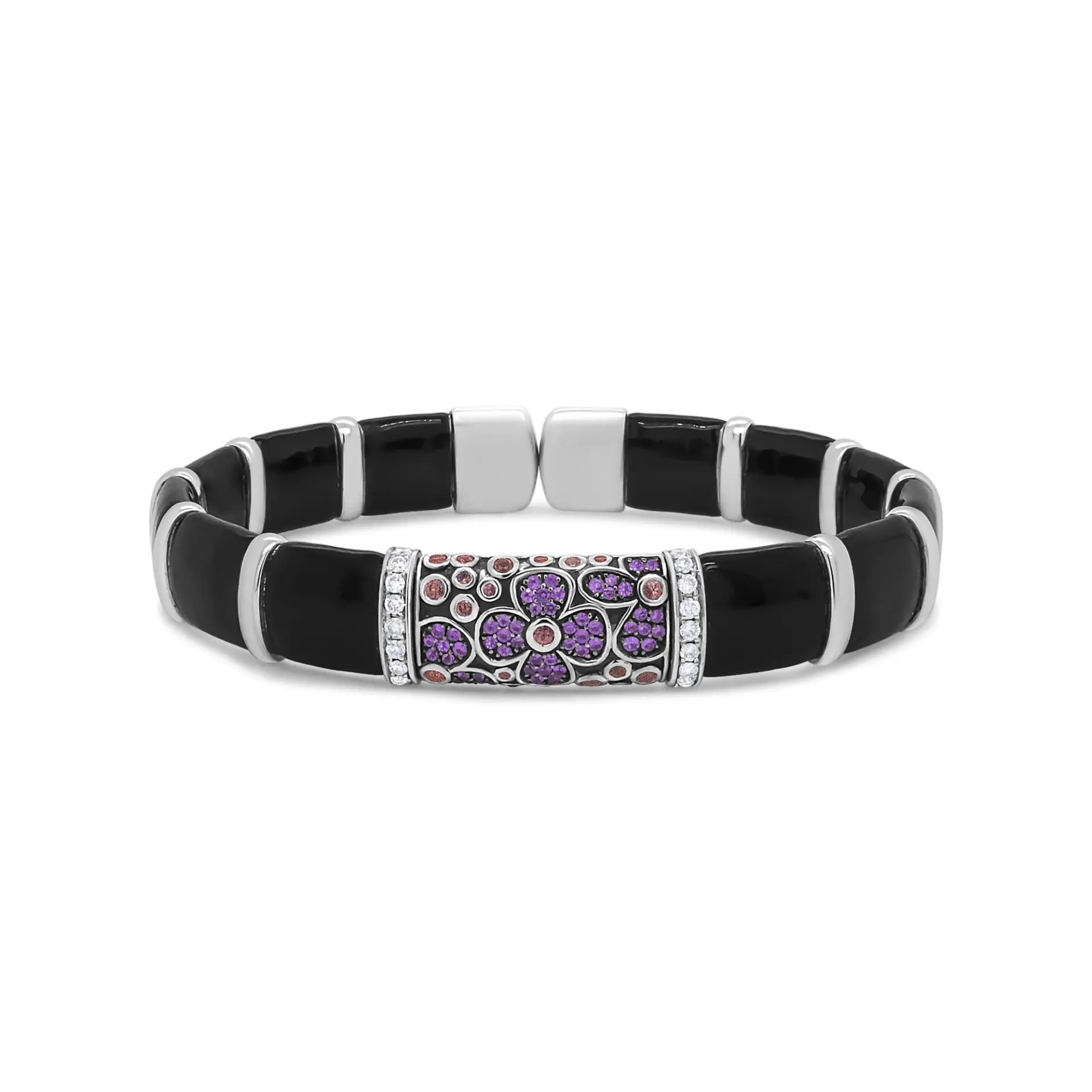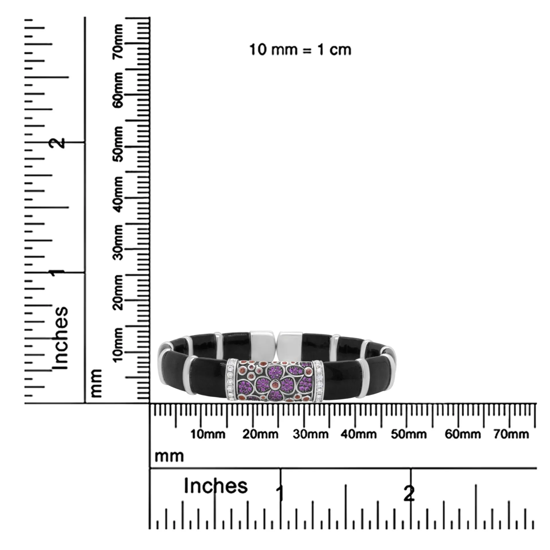 This statement bangle bracelet is a showstopper thanks to its intricate detail and sparkling collection of diamonds and gemstones. Crafted of fine .925 sterling silver with black and brown enamel, this bangle stuns in a floral motif. The natural 1mm round color-treated pink sapphires cluster together to form the petals of the flower blossoms, and are accompanied by 1mm and 1.5mm round color-treated orange sapphires. Flanking this flower depiction are rows of round, prong-set white diamonds that total 1/3 cttw with an approximate F-G Color and VS1-VS2 Clarity. This bracelet is 7.75 inches long, best for small and medium sized wrists.