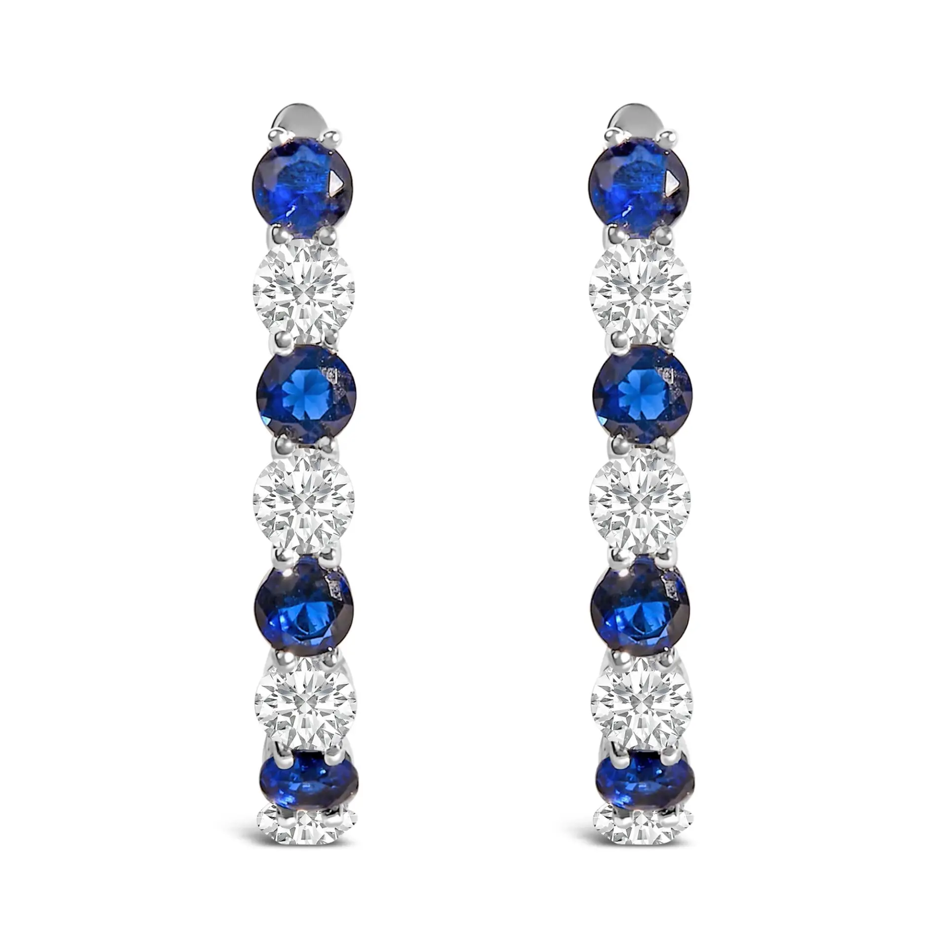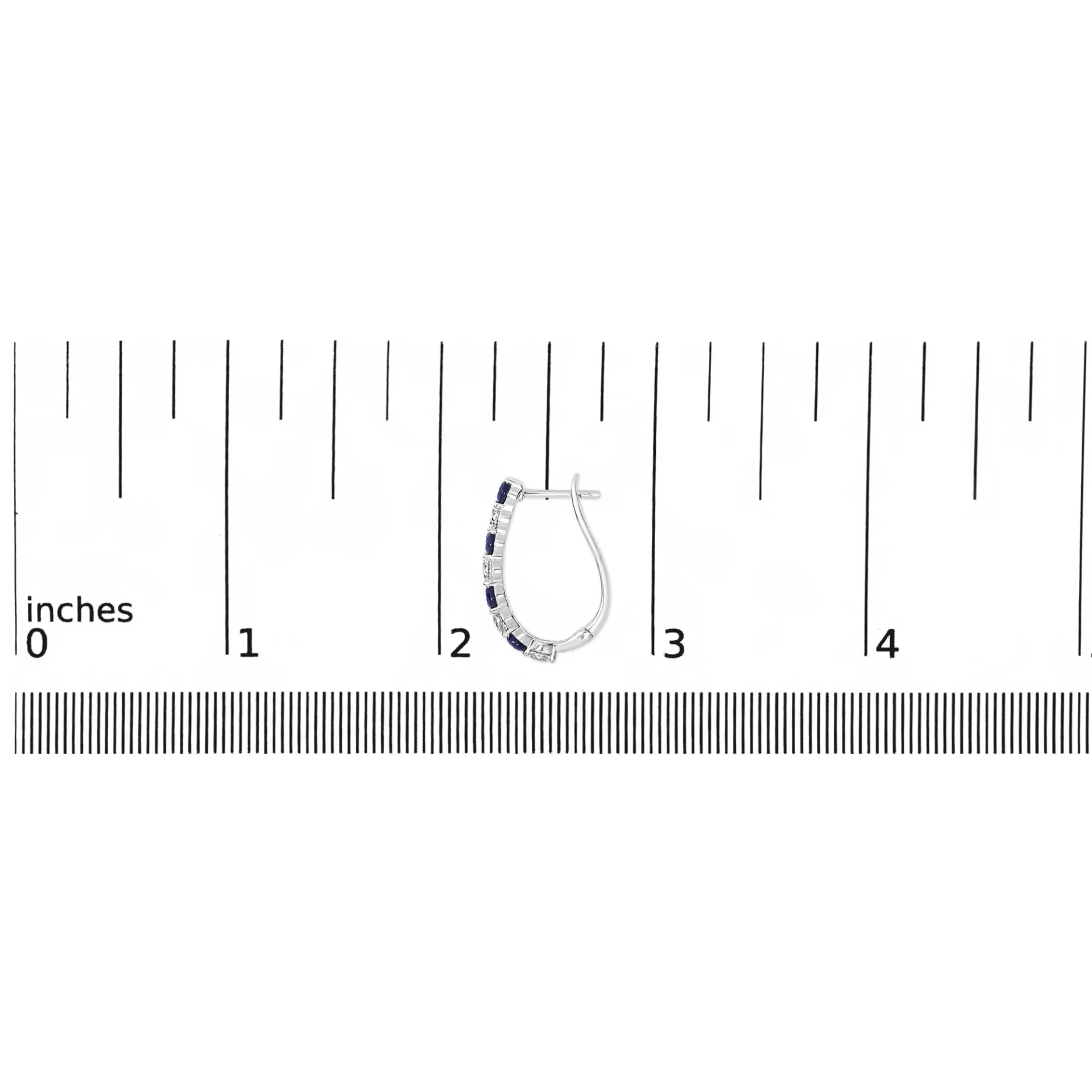 Immerse yourself in the elegance of these .925 sterling silver hoop earrings, expertly plated with rhodium for a luminous finish that captures the essence of sophistication. Each hoop is meticulously adorned with alternating 3×3 mm round lab-created blue and white sapphires, their brilliant hues enhanced through color treatment to produce a dazzling spectacle of light. The carefully engineered snap post backs provide a secure and comfortable fit, ensuring that these treasures gracefully encircle your ears, enhancing any ensemble. Perfect for those who cherish the beauty of sapphires and the durability of sterling silver, these earrings promise to be a timeless addition to your jewelry collection, offering a touch of glamour and an undeniable allure with every turn of your head.