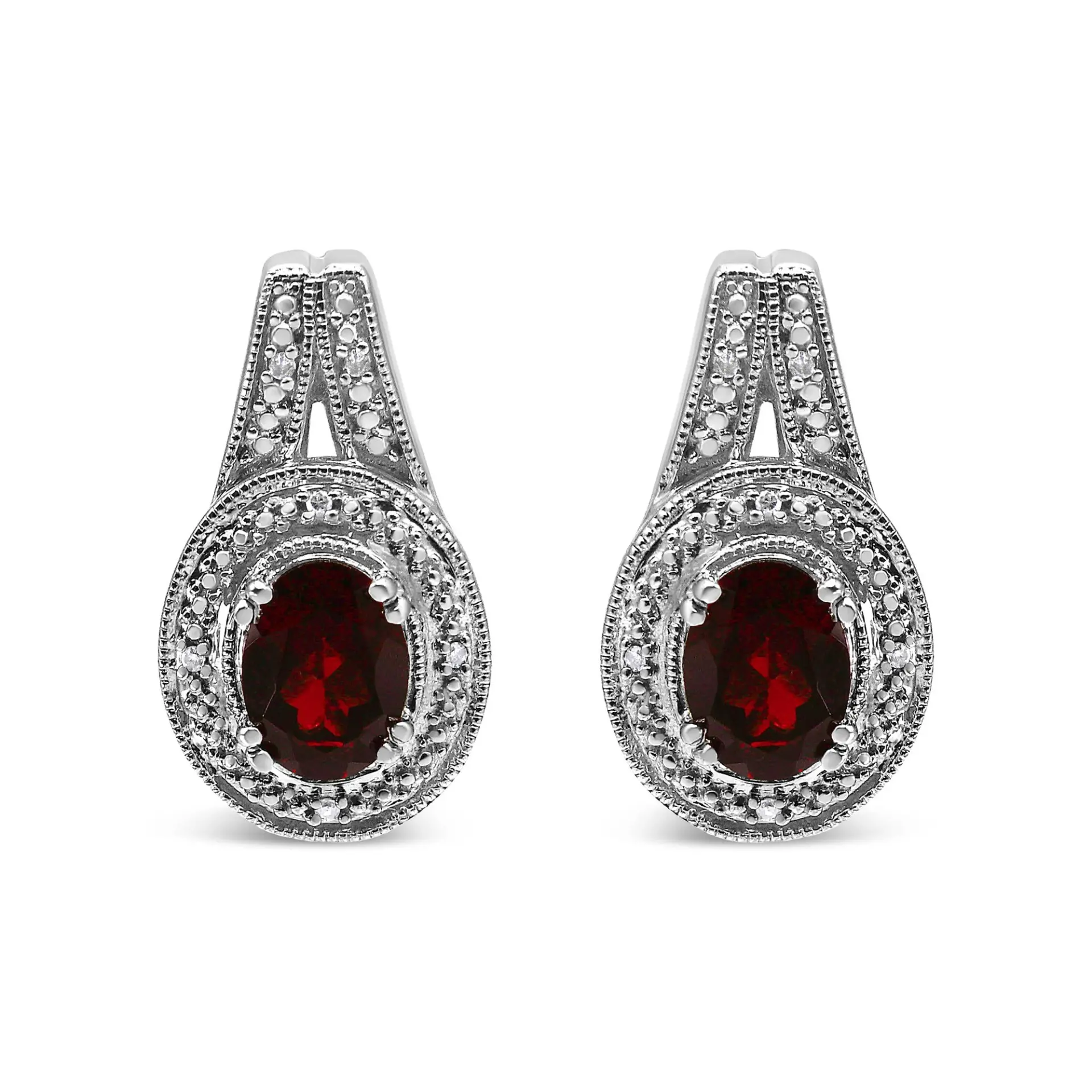 Exuding a regal charm in deep red, this pair of fashion stud earrings is simply elegant. The bold 8*6mm oval-shaped garnet gemstone is surrounded with a pretty milgrain design motif and round white accent diamonds of approximate I-J color and I1-I2 clarity. Set in .925 sterling silver, these earrings draw you in with their fiery beauty and intricate facets that catch and reflect the light in a dazzling display of color. Garnet is January’s birthstone and this pair of gemstone and diamond accent earrings provide a personalized look to complete the appeal of any outfit. Push back findings keep the earrings safe and secure for comfortable wearing.