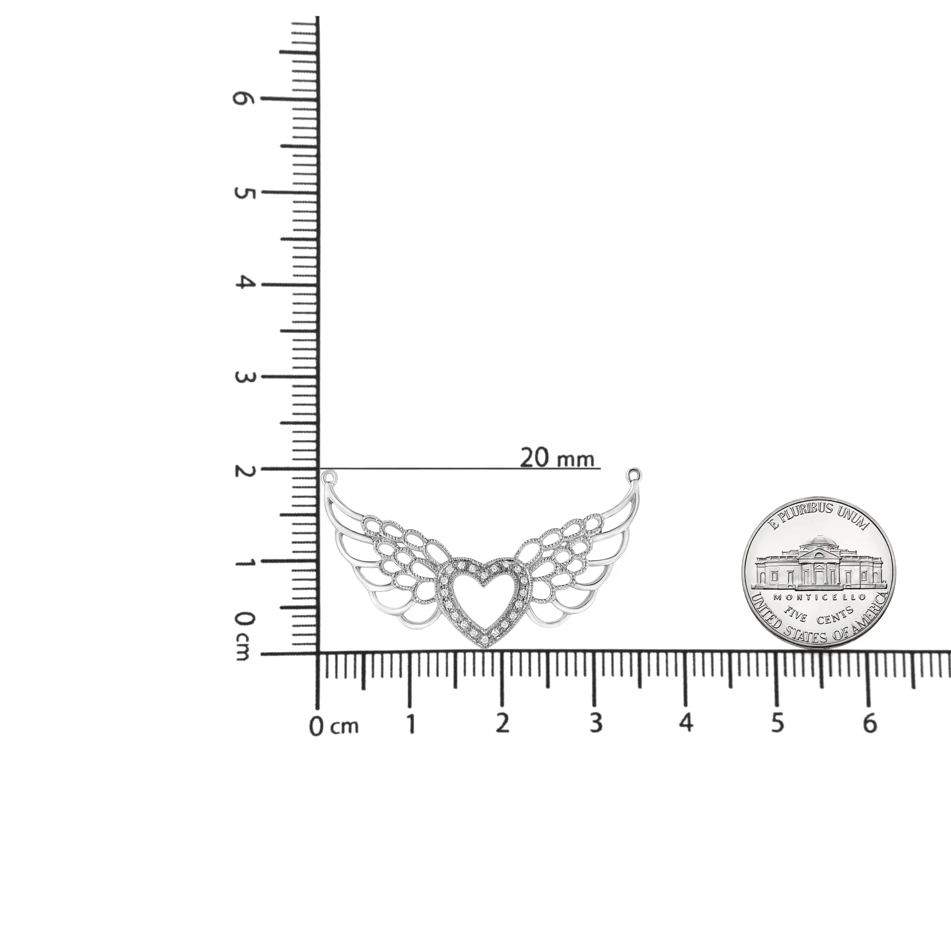 Gift this romantic and stylish diamond angel wings to your special angel. Styled on sterling silver this pendant features a glistening heart flies on brightly polished widespread angel’s wings embellished with 20 pave set round cut diamonds. This whimsical pendant hangs from a beautiful cable chain. Total diamond weight is 1/20 ctw.