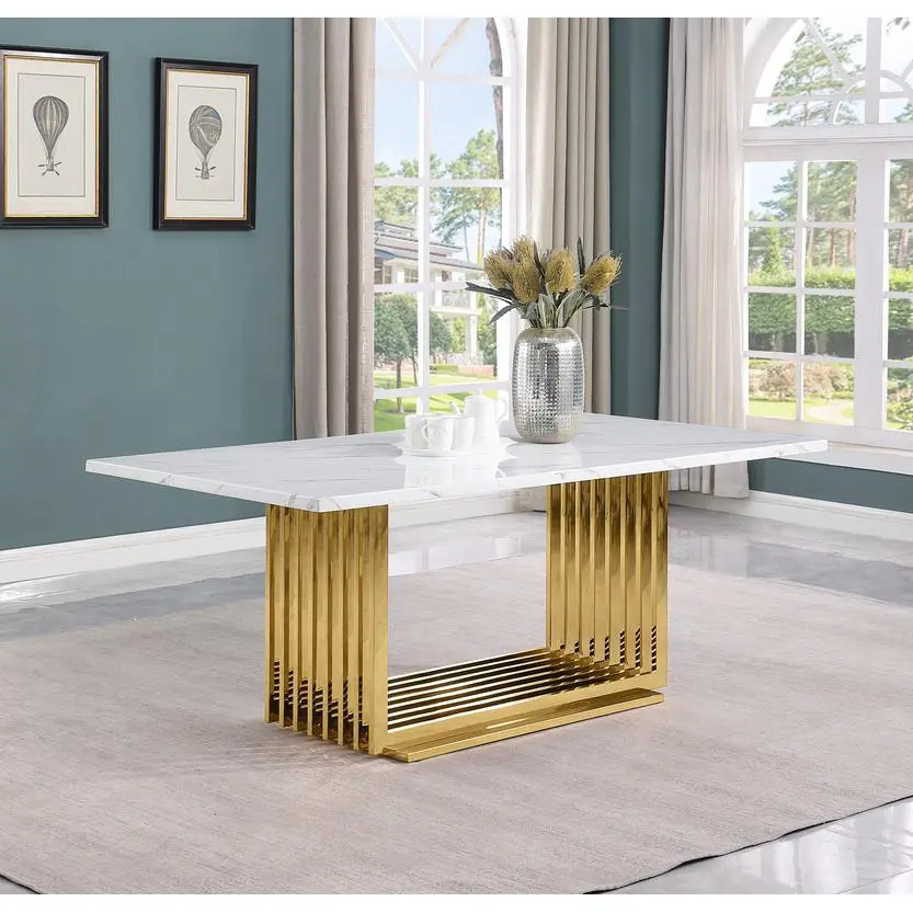 79″ long dining table White marble top 8 velvet side chairs Gold polished stainless steel Assembly required