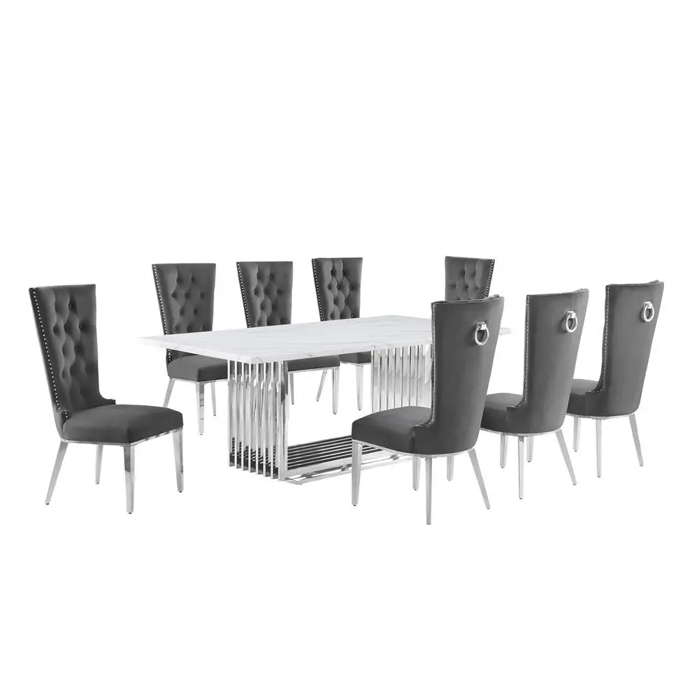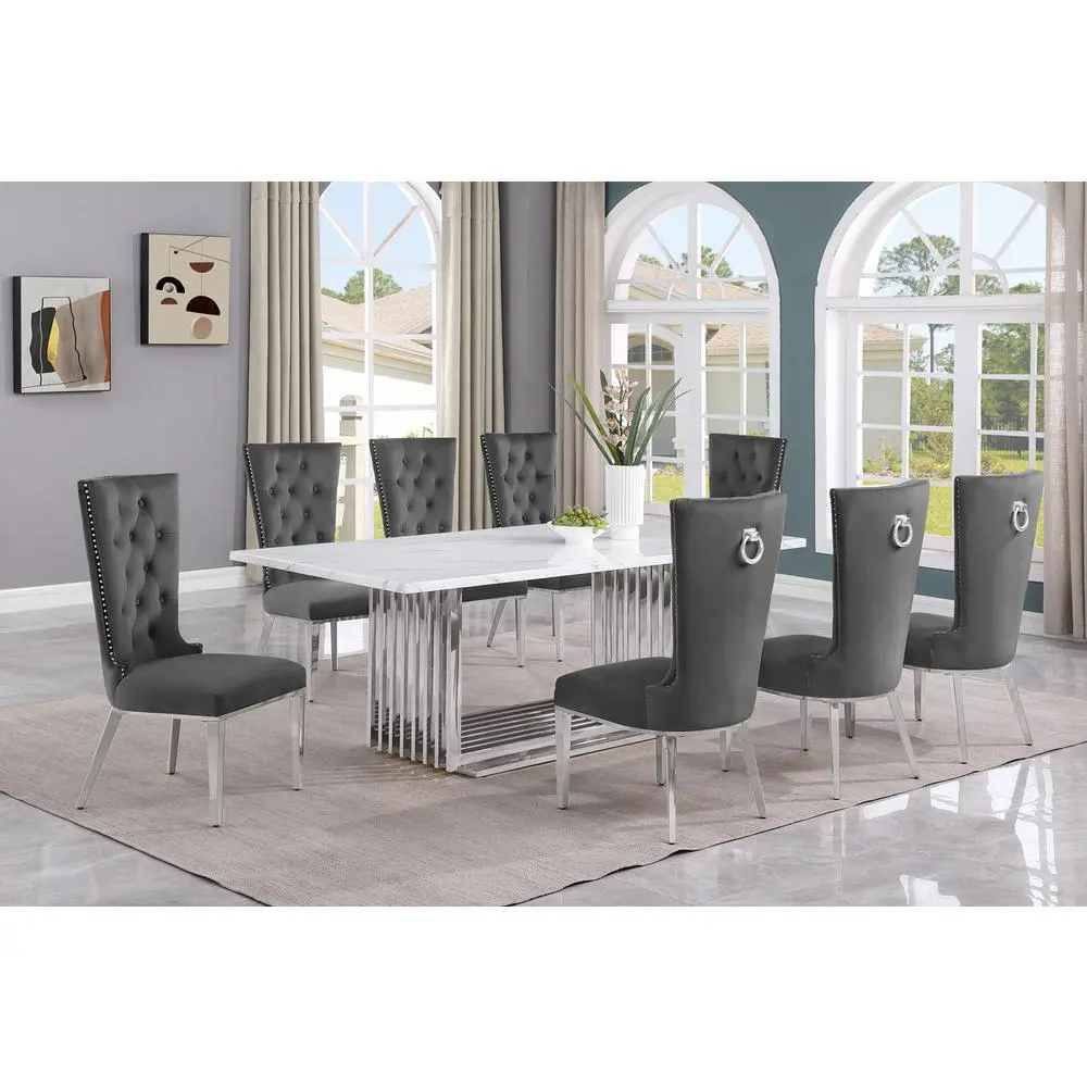 Experience a glam dining experience in the comfort of your home with this nine piece dining set composed of 1 white marble top dining table and 8 stylish side chiars. The dining table is made of a 79″ long white marble table top assembled on to a silver polished stainless steel base with a mirror finish. The side chairs feature a tall back rest with tufted buttons on velvet fabric, a decorative ring handle, and nailhead trim all constructed on to a durable iron frame with a silver chrome plating. This set requires assembly.