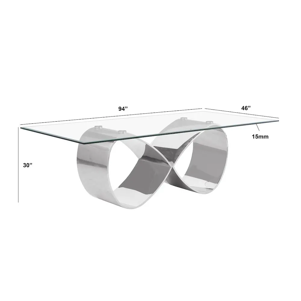 Introducing the Exclusive Infinity Dining Set by Best Quality Furniture Best Quality Furniture proudly presents our latest dining set, designed to elevate your dining space with an unparalleled blend of modern sophistication and timeless elegance. This exceptional set features an eye-catching, infinity-shaped base crafted from high-quality polished stainless steel, offering a sleek, reflective finish that adds a touch of contemporary luxury to your home. The base’s unique design flows seamlessly, creating a dynamic sense of movement while ensuring superior stability and durability. The table top is made from 15mm clear tempered glass, expertly beveled on the edges to provide a refined, polished look. The beveled edge further enhances the clarity and sophistication of the glass, giving the table a modern, clean aesthetic that beautifully complements any interior design style. To complete this set, weve paired the table with matching boucle fabric chairs, known for their soft texture and durability. The plush fabric is not only comfortable but also adds a subtle yet rich tactile quality to your dining experience. Each chair is finished with elegant nail head trim, providing a refined, classic touch that contrasts beautifully with the modern table base. For ease of setup, we highly recommend assisted assembly to ensure a smooth and secure construction. This dining set is the perfect choice for those looking to add both style and function to their dining room, making it an ideal setting for family dinners, intimate gatherings, and memorable celebrations.