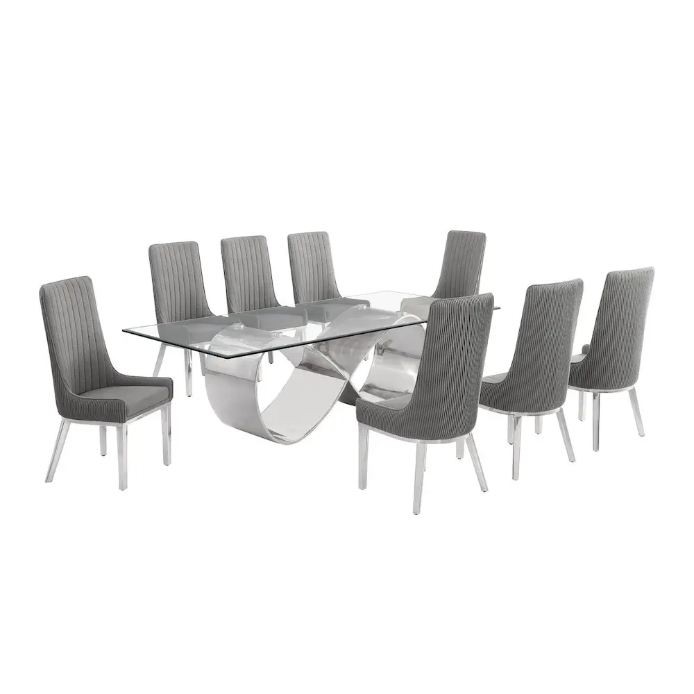9Pc Tempered Glass Dining Set 8 Rich Gray Boucle Side Chairs And Silver Base