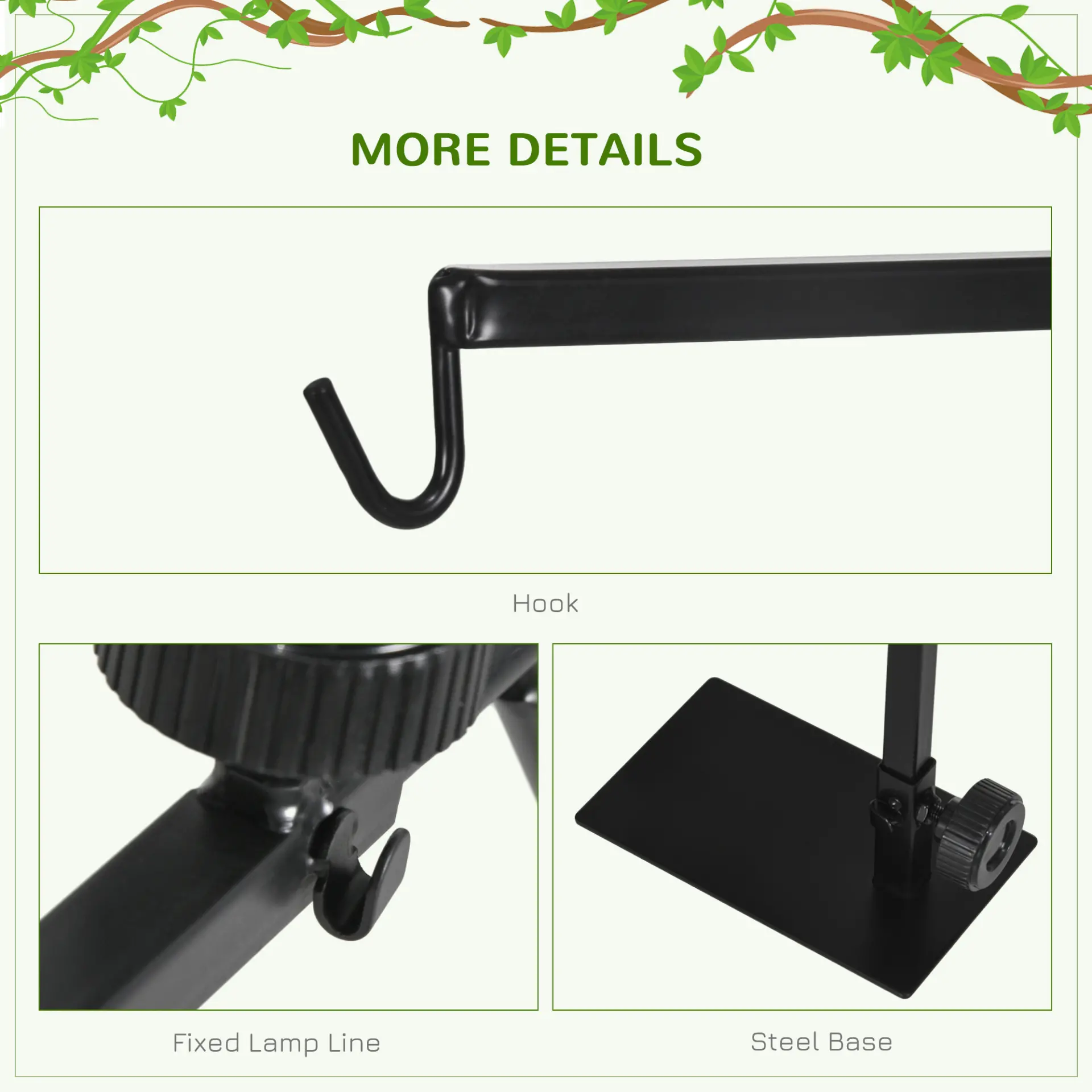 - Steel hook: For you to hang your lamp on, it comes with three slots on the stand to keep cords secure and neat.