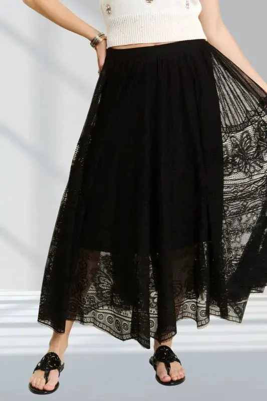 The Elastic Waist Raw Hem Lace Maxi Skirt is a bohemian-inspired piece perfect for a casual yet romantic look. The elastic waistband ensures a comfortable fit for all-day wear. The raw hem and lace detailing add a touch of texture and femininity to the skirt. This maxi skirt is versatile and can be dressed up or down for various occasions. Pair it with a flowy blouse and sandals for a laid-back yet stylish ensemble!